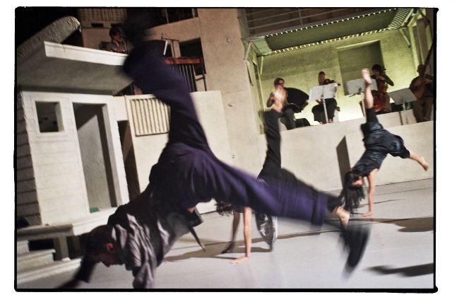 La performance qui se déroule au dessus des têtes des musiciens illustre à quel point la danse englobe aujourd’hui toute forme de mouvement corporel. Le sol de la terrasse du premier étage s’avère être un trampoline. Les sauts plus que périlleux, les atterrissages sur le dos, les impulsions que donnent les danseurs, tout se fait au rythme exact de la musique jouée en direct juste en dessous. C’est un défi non seulement pour les danseurs mais aussi pour les musiciens et musiciennes. Quand est-ce qu’on fait de la musique sous un « toit » qui bouge ?
