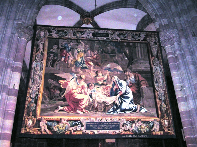 Pour en savoir plus sur elles, il faut se plonger dans la littérature spécialisée ou alors avoir la chance, comme moi, de rencontrer monsieur Xibaut, le chancelier de l’archevêque et de l’écouter parler de leur histoire mouvementée. « Pendant longtemps, nous ne savions pas non plus grand-chose concernant le passé des tapisseries » avoue-t-il ouvertement et sans détour. Ce sont les travaux et les recherches de ces dernières années qui ont apporté un éclairage dans ce noir historique. A l’époque de l’achat, en l’an 1739, il s’agissait d’une œuvre très moderne. Aujourd’hui il s’agit d’une rareté historique précieuse. La mode est un phénomène qui a une courte durée de vie. Ce qui est à la mode au printemps, passe pour de la ringardise en automne. Au 17e et 18e siècle, les choses étaient différentes, car, d’après le chancelier, quand les œuvres tissées sont arrivées à Strasbourg elles avaient déjà l’âge plus que respectable d’une centaine d’années. Et malgré ça, elles passaient pour être modernes. Elles étaient considérées comme précurseur d’un nouveau style – parisiennes somme toute. A l’origine, elles ont effectivement été créées pour Paris, plus exactement pour la cathédrale de « Notre-Dame » qui à l’époque était LA cathédrale française par excellence. En 1638, trois semaines avant la naissance de son premier enfant, Louis XIII avait fait un serment lourd de conséquences : Il voulait dédier la France toute entière à la Vierge Marie au cas où naîtrait un héritier mâle pour le trône. Que c’est effectivement arrivé est de notoriété publique. Que la vénération de la Vierge Marie a connu de la sorte son apogée en France est moins connu. En son honneur, il y eu un agrandissement du chœur de la cathédrale parisienne avec comme conséquence, que les 14 tapisseries n’avaient plus tout à fait les dimensions requises par l’architecture du passage. Mais le clergé parisien avait le sens des affaires. De plus, il tenait à renforcer le règne du roi béni par l’église, donc approuvé par dieu, à travers tout le pays. C’est la raison pour laquelle les seigneurs du chapitre de Strasbourg, tous issus de la noble famille des Rohan décidèrent spontanément d’acheter les tapisseries pour leur propre église. Accessoirement ils avaient l’ambition de faire de Strasbourg la deuxième ville de France après Paris. Pour y parvenir, suivre le goût dominant en matière de culture était à l’époque indispensable. Peu importe qu’il s’agisse des beaux arts, de littérature ou d’architecture – les Rohan voulaient à tout prix imiter les rois de France. « Cette acquisition était également motivée par des réflexions politiques » explique Xibaut cet achat quasiment stratégique. Les tapisseries n’avaient pas non plus les dimensions idéales pour le chœur de la cathédrale de Strasbourg – celui-ci était trop petit pour contenir les 14 œuvres d’un très grand format. Mais on a transformé cet inconvénient en avantage : on mettait les tapisseries, tout comme aujourd’hui dans la longue nef de la cathédrale, là ou se rassemblaient les croyants. De cette façon on opérait même un certain rapprochement avec le peuple, car ce qui à Paris n’était visible que pour les dignitaires du clergé pouvait être admiré par le commun des mortels à Strasbourg.
