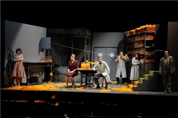 Le rôle du patriarche Signor Geronimo, un peu dur d’oreille, est chanté par Andrey Zemskov. Il cherche désespérément à améliorer sa condition d’artisan en mariant l’une de ses deux filles, Elisetta, à un comte. La première de cet opéra a eu lieu en 1792 au Burgtheater à Vienne, en Autriche. Le metteur en scène de la présente production, Christophe Gayral, a situé l’action dans les années cinquante du 20e siècle. Son Geronimo est à la tête d’une entreprise familiale, où ses filles Carolina et Elisetta ainsi que le commis Paolino, travaillent des plumes « orange-pétard ». Ce qui frappe dans le décor (Camille Duchemin) du premier tableau, ce sont les effets optiques très efficaces qui se prolongent de différentes manières jusqu’à l’entracte : Un lieu de travail gris et fonctionnel, avec un petit bureau séparé pour le patron, est joliment agrémenté par la présence des plumes oranges, impeccablement rangées dans des boites transparentes, proprement empilées sur des étagères en attendant d’être travaillées. Au fil des tableaux suivants, cette matière aérienne atterrit sur la table de travail pour finir suite à un geste incontrôlé de Carolina sur la tête du comte Robinson (Jean Gabriel Saint et Oliver Déjan chantent le rôle, selon les jours, en alternance). Le livret de Giovanni Bertati peu avare de ce type « d’éruptions » a permis de sauvegarder le coté amusant de cet opéra jusqu’à aujourd’hui sans prendre une ride. Le roc dans la tourmente « des émotions en émoi » c’est, du moins en partie, Fidalma (Eve-Maud Hubeaux), la sœur du patron. Malgré tout, elle aussi essaie d’attraper un peu de bonheur conjugal. Et c’est sur Paolino (Xin Wang) qu’elle a jeté son dévolu. Mais il se trouve que celui-ci, en contradiction totale avec toutes les conventions sociales, a épousé en cachette Carolina (Anaïs Mahikian).
