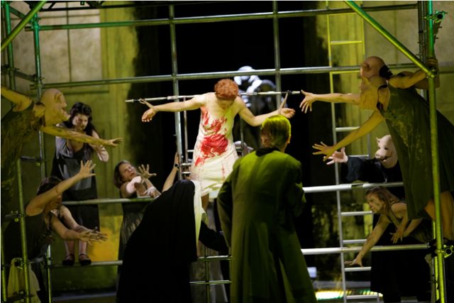 A aucun moment Silviu Purcrete qui signe la mise en scène ne se laisse emporter par un voyeurisme superficiel, même dans le tableau très fort, où l’abbesse barbouille la chemise blanche de l’enfant de sang. On épargne l’ostentation plate de blessures du corps et de l’âme au public ; la souffrance est exprimée par la musique et le texte. Ce n’est pas contradictoire du tout. Au contraire : ces doses homéopathiques influent beaucoup plus subtilement sur le ressenti émotionnel du public que ne le feraient des scènes de tortures et de déchéance physique.