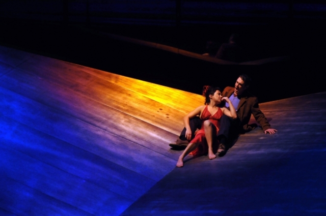 Le décor en revanche reste discret. Le palais d’été du premier acte, légèrement suranné et décrépi, fait fortement penser au romantisme et cadre avec la musique de Strauss sans grands frottements. Il transmet ce que l’on imagine de l’improvisation, du chaos artistique et de la dolce Vita à laquelle s’adonne la haute société. Les plaques de roche tectonique du deuxième acte, fortement délimités de la mer bleue, qui s’insère comme une crique, permettent des liens directs avec les recoins et les bords abrupts, les profondeurs de l’âme humaine. La famille des mécènes, mais aussi tous les autres spectateurs, comme le compositeur ou le professeur de musique semblent au cours de l’action dépassés par le coté dramatique d’Ariane et quittent la scène les uns après les autres. Jusqu’à ce que ne reste plus qu’Ariane allongée par terre, seule, séduite par le jus de raisin pressé par Bacchus.