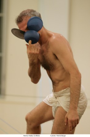 Et Enrico Tedde a joué l’équilibriste, totalement ! Même l’échec éventuel ne l’a pas fait reculer. La contrainte d’une date fixe à laquelle cette œuvre devait être terminée non plus d’ailleurs. Sa seule trame était un texte de son frère décédé qu’il a, contrairement à ce qui se fait habituellement, récité lui-même. Ce texte ne raconte pas d’histoire, il n’emmène pas non plus l’auditeur dans un monde étrange mais tourne autour du thème de ce que c’est qu’être homme, l’espace de vie de l’homme et son expression verbale.