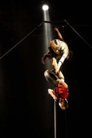 Tout ce qui est montré l’est sans ostentation: qu’il s’agisse de grimper à trois sur une barre tout en se faisant mutuellement obstacle ou de glisser avec élan sur le ventre sur de grands ballons de gymnastique bleus. La lumière du stroboscope alors que Kosonen fait ses saltos vertigineux sur le trampoline, met tout simplement la vie de l’acrobate en danger, puisque les éclairs de lumière peuvent lui faire perdre son sens de l’orientation. Tout ceci est le résultat de la mise en scène de Maksim Komaro qui est connu en Finlande pour son travail dans le milieu du cirque. Mais ce ne sont pas que les numéros d’acrobatie qui distraient les spectatrices et spectateurs. Les nombreux gags avec les pneumatiques de voiture et de poids lourds ainsi que les accessoires de gymnastique donnent un coup d’accélérateur supplémentaire. C’est hilarant de voir avancer maladroitement les acrobates habillés en bonhomme de pneumatiques ou de les observer en tenue de jeune fille qui s’active sur deux pneus différents comme si elle était «coupée» en deux morceaux. Le numéro du cheval dansant fait carrément basculer le spectacle vers le grotesque : à l’intérieur du cheval qui voudrait bien être monté par un montagnard canadien se cachent deux acrobates. Et bien entendu, au moment même où le cavalier est sur le point d’enfourcher sa monture, le cheval «se sépare en deux» pour se transformer en «diva chevaline à la crinière opulente » qui cherche à séduire le malheureux. Ce numéro arrive de façon inattendue mais il arrive à point. Il se glisse entre tous les autres numéros qui eux se satisfont de quelques accessoires modestes. En faisant un parallèle avec «l’arte povera» on pourrait définir ce spectacle comme «circo povero» : l’équipement est minimaliste ; des objets du quotidien qui ont fini leur vie depuis longtemps sont réutilisés de façon intelligente.