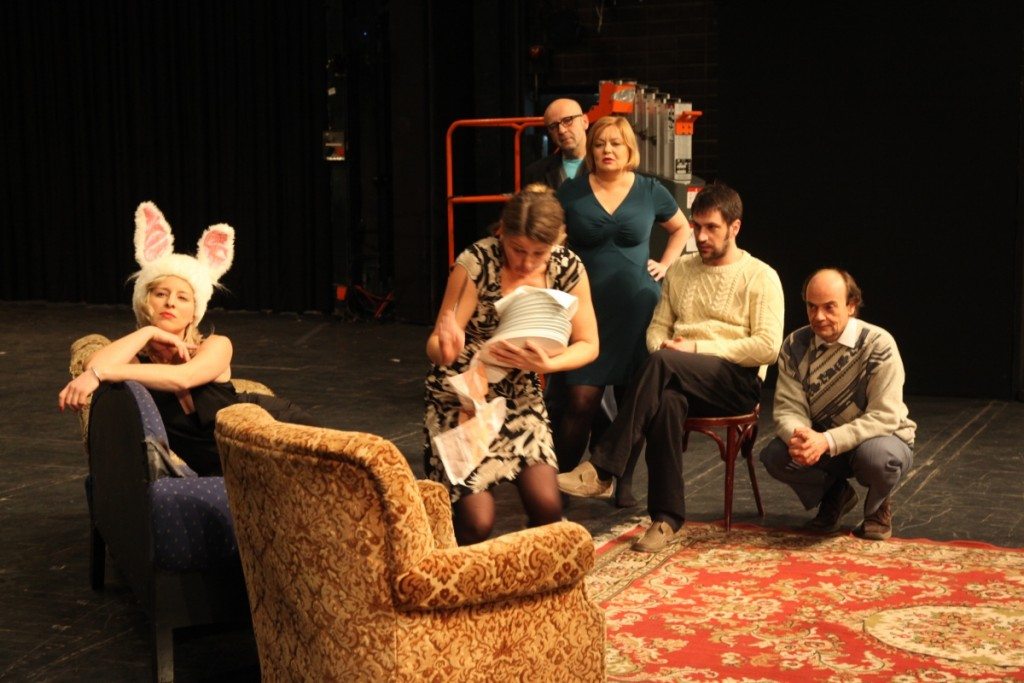 Jelčić, auch für die Bühne und die Kostüme verantwortlich, verwendet ein zerschlissenes Sofa, zwei Fauteuils und einen desolaten Perserteppich, nicht um ein Spiel im Spiel zu inszenieren. Vielmehr ist es ein Spiel, das zeigt, wie ein Spiel entsteht und welche Mechanismen im Theater heute dabei wirksam werden. Da ist an einer Stelle von einem „dekadenten Stück“ die Rede, über das sich alle Beteiligten, außer der hasenbeohrten Schauspielerin und dem jungen, hochgewachsenen Autor, beschweren. Krešimir Mikić, jung, hochgewachsen und ein Ausnahmetalent im komischen Fach, ist zugleich so etwas wie ein Vermittler zwischen dem Ensemble und dem Publikum. Als Jungautor Konstantin lernt er Ablehnung und Speichelleckerei in rascher Abfolge hintereinander kennen. Letzteres jedoch durch ein Kalkül ausgelöst. Denn schließlich möchte Boris, Tschechows erfolgreicher Belletrist in seinem Stück, die Mutter von Konstantin für sich gewinnen. Sein plötzlicher Gesinnungsschwenk drückt sich durch einen pseudointellektuellen Kommentar zum „Nichts“ seines jungen Kontrahenten aus. Umgehend stimmen auch alle anderen eine Lobeshymne auf das revolutionäre Werk an und bitten die Schauspielerin um eine zweite Vorführung.