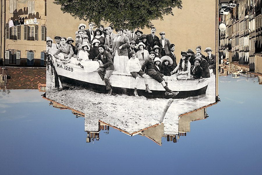 - JR, UNFRAMED, un groupe posant dans une barque amar rée sur la plage revu par JR, vers 1930, Marseille, 2013 © JR, 2014