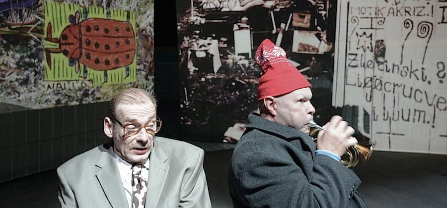 Die dritte Erfolgssäule des Abends bilden Dietmar Nigsch als August Walla und Peter Badstübner als Ernst Herbeck. Der eine ein gutmütiger, voluminöser Riese in viel zu kurzen Hosen mit breiten Hosenträgern, einer roten Skimütze auf dem Kopf, einer roten Damenhandtasche in der Hand und in Besitz einer kleinen Trompete, die ihm gute Dienste leistet. Der andere verschroben staksig in seinem viel zu großen Anzug steckend, den rechten Arm wie gelähmt an den Körper geschmiegt und durch eine Brille die Welt außer sich doch nicht erblickend. Wer den Vergleich mit Bildern von Walla und Herbeck heranzieht, kann ermessen, wie kongenial diese Besetzung gelungen ist. Nigsch gelingt das Kunststück, seine massige Erscheinung so kindlich naiv in Szene zu setzen, dass ihm die Herzen automatisch zufliegen müssen. Badstübner hingegen besticht durch seine spastischen Körperbewegungen und seinen introvertierten Blick, der sich nur dann zu Grimassen verzieht, wenn er die Reaktionen der Außenwelt nicht mehr unter Kontrolle hat.