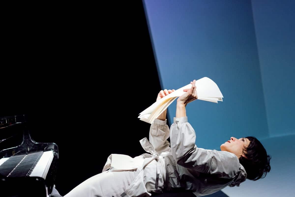 In einer Mischung aus tonalem Wohlklang und atonalen Kompositionen schlägt sie einen großen Bogen vom Heute zurück an den Beginn des 20. Jahrhunderts. Und das mit einem präzisen, kraftvollen Anschlag, den man der zarten Frau gar nicht zutrauen würde. Auch die Texte scheinen wie aus der Zeit gefallen und pendeln zwischen dadaistischen Anklängen und freien Assoziationsketten, die viel Interpretationsspielraum lassen. Erklärungsmodelle zu ihren Texten liefert sie jedoch zu Recht nicht mit. An einer Stelle unterlegt sie ihr Klavier mit einem herzschlagähnlichen Sound, an anderer Stelle krabbelt sie in kleinen Mini-Schrittchen auf allen Vieren auf dem Boden herum. Auch sprach- und musiklose Pausen bauen Spannung auf, entschleunigen aber zugleich auch das Geschehen enorm.