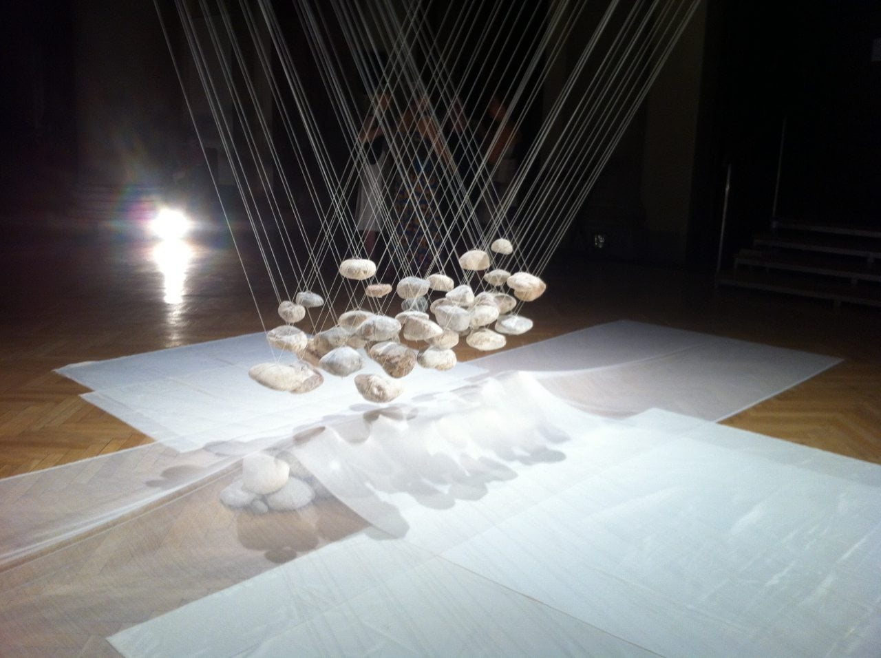 Die beeindruckende Installation im Foyer im ersten Stock vor dem Theatersaal stammt von Laurent Ziegler, der Murobushi auch über viele Jahre lang fotografisch begleitete. Waghalsig und in höchstem Maße ästhetisch trotzen unregelmäßig geformte, helle Steine in einem kunstvollen Geflecht aus parallel an die Decke laufenden Fäden scheinbar der Schwerkraft.