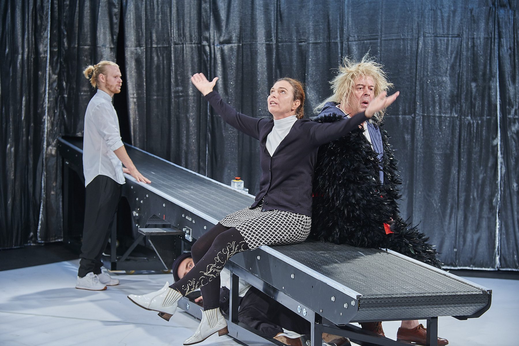 Das einzige Ausstattungsstück auf der Bühne ist ein Fließband. Es liefert die Schauspieler, die sich roboterartig zu einem kleinen Walzer (Bernhard Eder) bewegen und ihrem täglichen Leben nachgehen. Es ist je nach Bedarf Bett, Bar, Tisch oder Lieferant für alles, was das Herz begehrt: Fahrrad, Frau, Hose, Gebärmutter. Was immer gebraucht wird – das Fließband liefert.