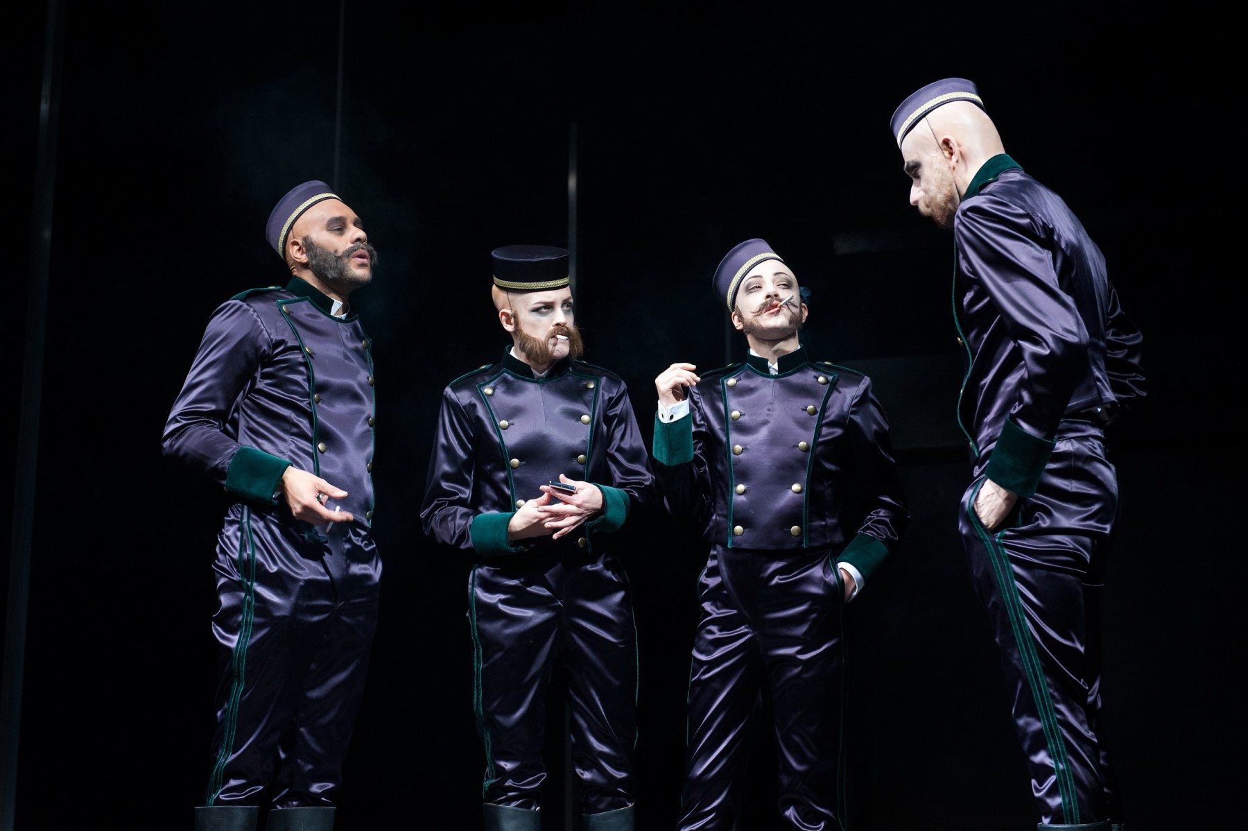 Sie tragen dunkelblaue, seidig glänzende Uniformen und aufgeklebte Schnurrbärte. Ihre Augen sind dunkel umrandet, das Gesicht hell geschminkt und abgesehen von der unterschiedlichen Körpergröße ähneln sie sich wie ein Ei dem anderen. Willkommen in der Zeit, die man in der Sprache der Kunst Theater nennt.
