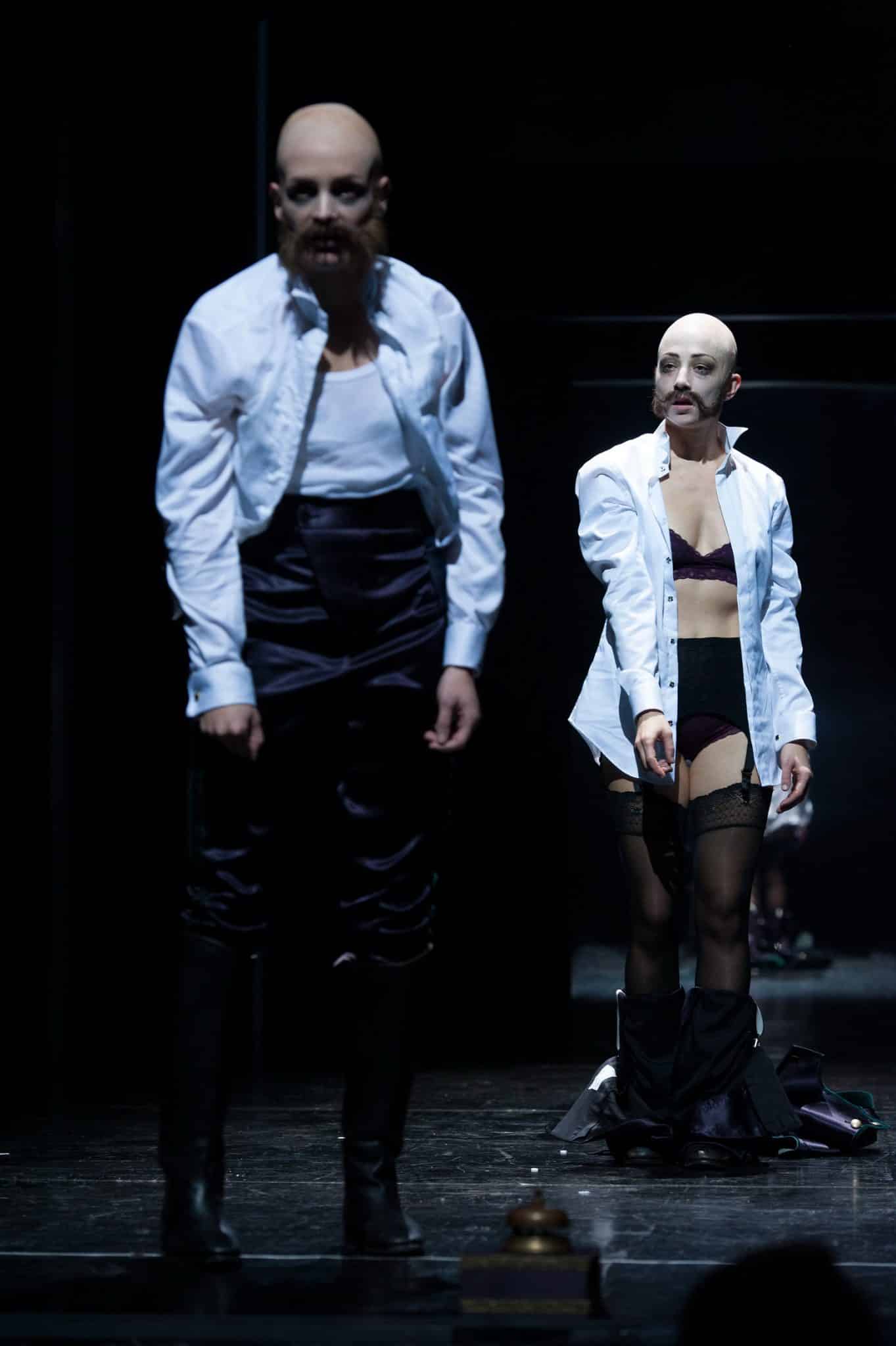 In grandioser Art und Weise darf Fabian Krüger zuvor jedoch noch in einem Conchita-Wurst-Verschnitt, mit tänzelnden Schritten, in die Luft gewirbelten Armen und zurückgeworfenem Köpfchen, sich bei einem Rendezvous zieren. Mehr schwebend als schreitend, verletzlich in Strapsen und High-Heels, die zwar die Anziehungskraft zwischen den Geschlechtern versinnbildlichen, dennoch aber nicht plump oder ordinär wirken, ziert er sich berückend vor der ersten gemeinsamen Nacht.