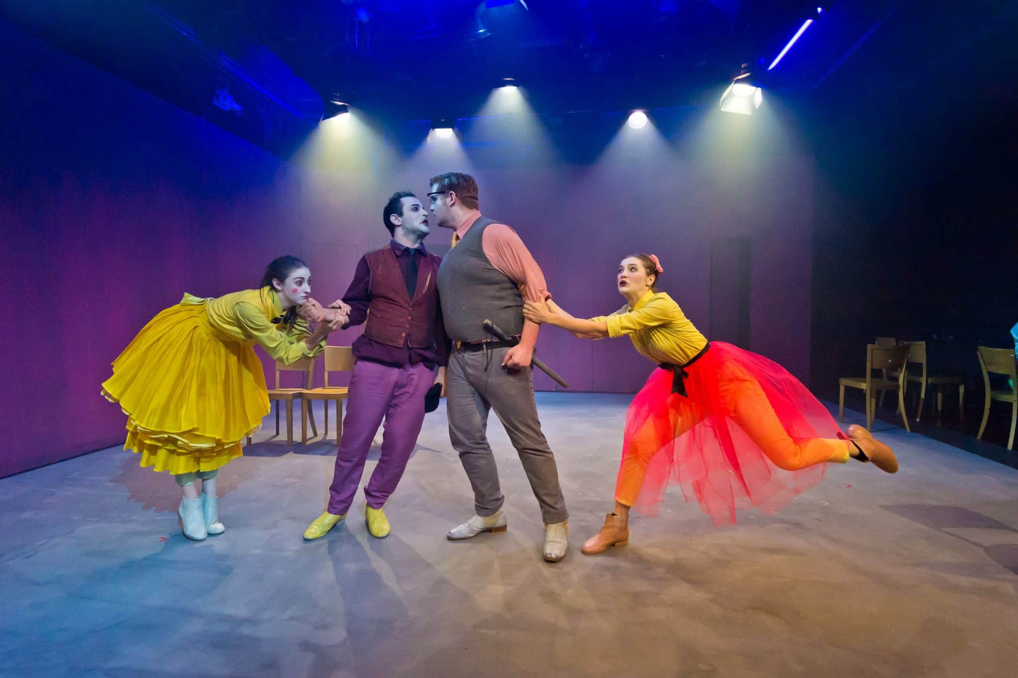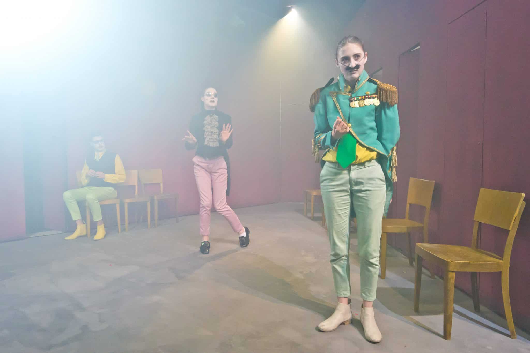 Ultras saturierter Gegenspieler, der Bürgermeiser, wird, je länger sich die Revolten zuspitzen, von Albträumen geplagt, die ihm keine Sekunde Nachtruhe vergönnen. Stefanie Darnesa weiß, wie Despoten ticken. Sie brüllt, sie kommandiert und delegiert und schiebt ihren ausgestopften Embonpoint vor sich her, dass man fürchtet, die Knöpfe ihres zu engen Wamses unversehens ins Auge zu bekommen. Ein Nestroytalent der Sonderklasse ist auch Marta Kizyma, die in der Rolle der verliebten Cecilie wie aus einer Commedia dell`arte Inszenierung herausgesprungen zu sein scheint. Gemeinsam mit Verena Maria Bauer, die ihr Freundinnen-Gegenstück mimt, springt sie über die Bühne, zerfließt beim Anblick ihres Angebeteten und versucht, ihren Vater von der Feindschaft zu ihrem zukünftigen Bräutigam abzuhalten. Benedikt Paulun lässt mit einem Schlagstock bewaffnet die Gewaltbereitschaft des herrschenden Systems spürbar werden und trägt gleichzeitig seine Feigheit zur Schau: „Wo ein anarchisches Krawallerl ist, bin ich schon die Wolke!“ Maria Magdalena Mund stößt als seine Frau, während des Besuches eines angeblichen Geistlichen, ein wunderbares Jammergeschrei an, in dem sie beklagt, dass nun der jüngste Tag anbreche und das, obwohl sie nicht Staub gesaugt habe. Alle Beteiligten sehen sich an diesem Abend mit der Herausforderung konfrontiert, dass sie nicht nur einen, sondern mehrere Charaktere zu spielen haben. Rasche Kostüm- und ebenso rasche Szenenwechsel machen das möglich. Andreas Gaida und Florian Appelius als subalterne Beamte Sigmund und Willibald sind das Salz in der Schnellsprech-Suppe. Köstlichst, wie sie sich ducken und aufmucken, wie sie buckeln und treten und sich gegenseitig stets im Zaum halten, oder auch befeuern.