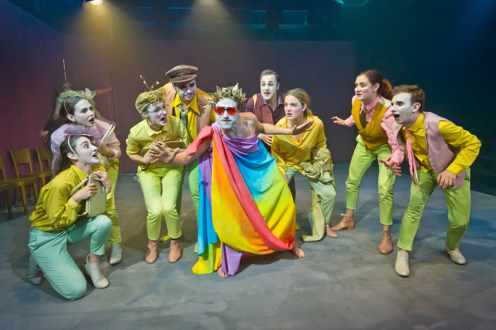 Die fünf Männer und sieben jungen Frauen spielen frech, spritzig, witzig, aufwieglerisch und vor allem durch und durch komödiantisch – von den gefärbten Haarspitzen bis zu den Zehennägeln. “Was recht is is recht, was zvü is is zvü!“, die Eingangsparole, die von der Krähwinkler Bevölkerung noch im Untergrund beschworen wird, bildet das erste Aufflammen jener Revolution, die am Schluss des Geschehens die Machtelite w.o. geben lässt. Burak Uzuncimen steht als unerschrockener Nachtwächter Dunkelgraus der unzufriedenen Gemeinschaft vor, die sich jedoch nicht wirklich im Revoltieren auskennt, da es keine Studierenden in diesem Land gibt. Da braucht es nicht nur die zusätzlichen, insurgierenden Gedanken von Eberhard Ultra, dem Gesandten aus dem fernen Wien, in dem schon längst Freiheit und Einigkeit herrscht, sondern auch seinen strategischen Kopf. Stanislaus Dick, der diesen Charakter unglaublich fulminant auf die Bühne zaubert, agiert, als ob er ein alter Schauspielhase und mit allen komödiantischen Wassern gewaschen wäre. In keiner Sekunde ist er unglaubwürdig, in keinem Augenblick ist eine handwerkliche Unsicherheit spürbar und das Beste: Dieser Ultra hat nicht nur die Krähwinkler, sondern auch das Publikum fest im Griff. In seinen vielen Verkleidungen und Charakterverstellungen wird in dieser Inszenierung dennoch klar: Uneigennützig agiert diese menschliche Lunte, die das revolutionäre Pulverfass in Krähwinkel schließlich zum Zünden bringt, auch nicht. Die Aussicht auf eine reiche Partie in der Gestalt von Frau von Frankenfrey beflügelt ihn nicht nur in politischer Hinsicht. Maria Strauss agiert in dieser Rolle souverän und bleibt auch dann noch ganz unabhängige Herrin, als ihre Felle durch Korruption davonzuschwimmen drohen.