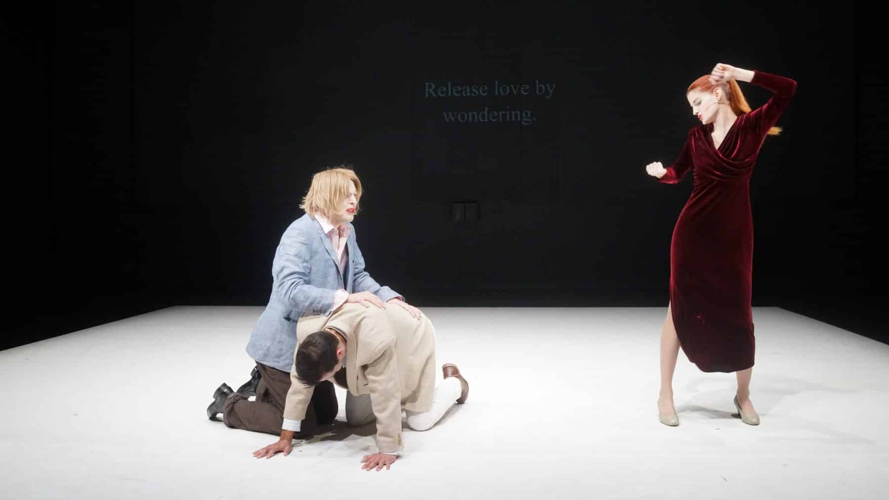 Herrlich, wie Dimchev die Beziehungsfäden spinnt und an einer Stelle seinen Widersacher wie eine Kuh muhend an die Rampe nach vorne schickt. Wunderbar, wie er sich kniend an dessen Hand klammert, um ihn zu beschwören und um Verzeihung zu bitten. Köstlich, wie er ihn mit herrischer Geste von der Bühne abgehen lässt um freie Bahn für sein Liebeswerben zu haben. Zugleich läuft eine Übertitelung, in der das Absurde zur Höchstform aufläuft, aber einzelne Sätze wiederum höchst philosophisch und passgenau das Geschehen bezeichnen.