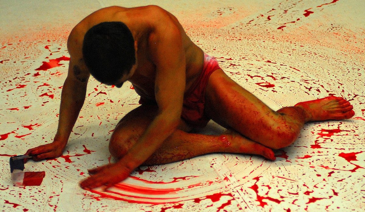 Nachdem er die Jacke abgelegt hat, wird sein rotes T-Shirt sichtbar, unter dem er, so hat es den Anschein, plötzlich zu bluten beginnt. Ein beständiger, ruhiger Strahl tropft von der Höhe knapp unter seinem Brustbein über seinen Körper, färbt sein Shirt dunkel und kündet von einer sonst unsichtbaren Herzwunde. Der Mann, der hier vor dem Publikum steht, leidet und macht sein stilles Leid für alle drastisch sichtbar. An diesem Abend wird noch mehr Blut zu sehen sein. Oder zumindest eine Farbe, die sich wie von Zauberhand in eine blutrote Flüssigkeit verwandelt. Ein rosarotes Pulver, elegant und prätentiös in die Luft geschleudert, verändert sich am Boden in eine tiefrote Flüssigkeit, auf der Bakalov bäuchlings zu rutschen beginnt. Dass er in Paris als Taxifahrer arbeitete, dass er Exkremente von Mensch und Tier beseitigte, all das weiß man schon. Und die Frage, wie lang dieses Leiden andauern würde, beantwortet der Künstler später. 20 Jahre hat er in Frankreich gelebt.