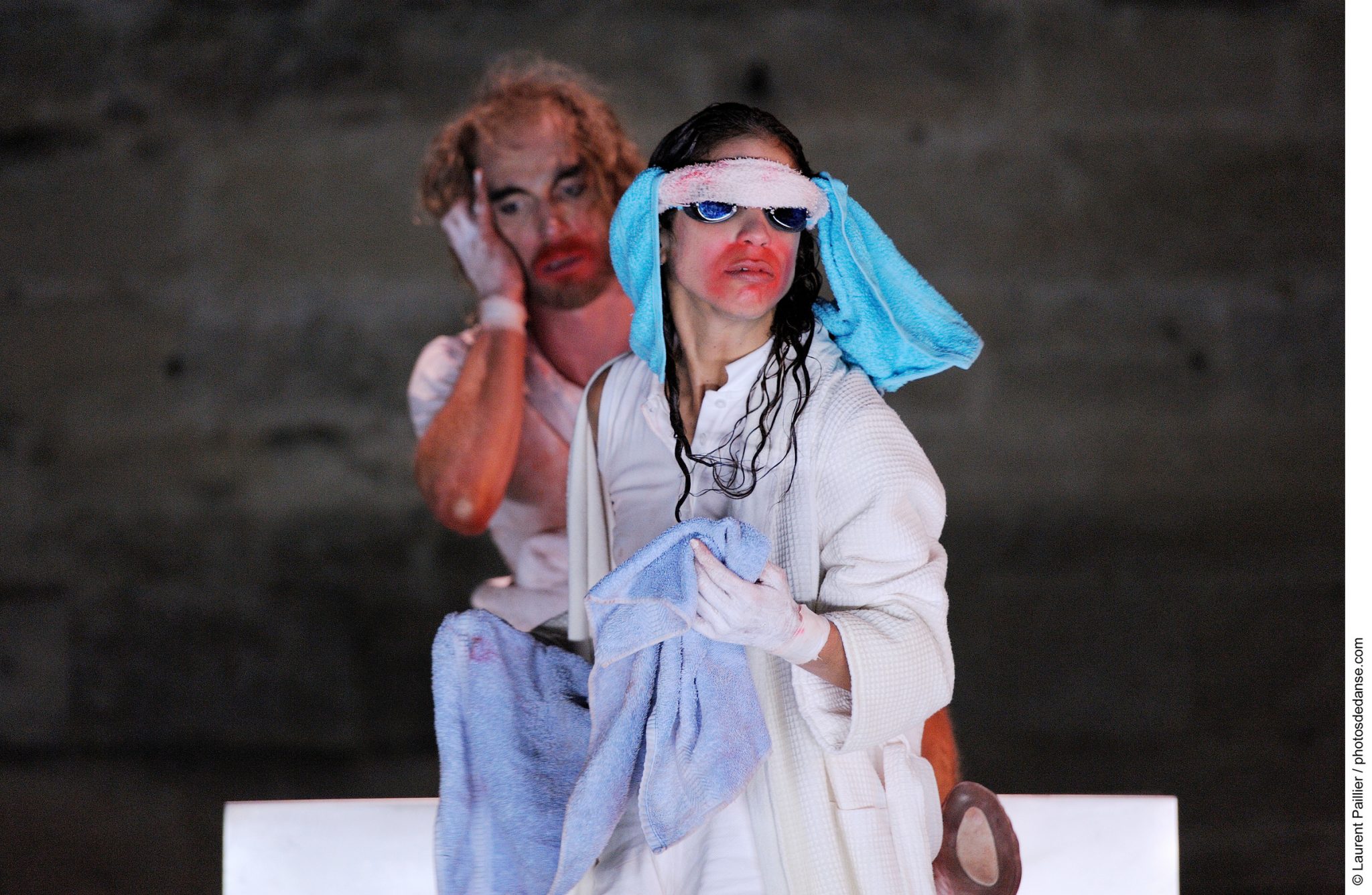 Ein großes, hellblaues Styroporpferd, ein kleines Podest – wie man es von Siegerehrungen her kennt, und mehrere Handtücher, zwei Bademäntel, zwei weiße Helme und 2 Stecken – an die man normalerweise Putzgerätschaften steckt um Böden zu reinigen – mehr bedurfte es nicht, um die Geschichte eines Paares zu beschreiben, das sich auf Gedeih und Verderb aneinander ausgeliefert hatte. Stark geschminkt, mit großen, roten Mündern und bronzierter Haut, war klar, dass das hier Gezeigte symbolisch für abertausende Schicksale stand. Schicksale, die meist niemand erzählt, aber viele von uns in der eigenen Familie oder von Freunden kennen. Montero Freitas Bühnengesicht mit dem übergroßen, roten Clownmund, dem weißen Stirnband und der UV-Schutzbrille ist in diesem Sommer vielen Wienerinnen und Wienern bekannt – denn sie ziert damit eines der Hauptsujets des Impulstanz-Festivals auf vielen Plakaten in der Stadt. Merk trug passend dazu dasselbe Outfit – ein Herz und eine Seele waren da zu Beginn auf der Bühne vereint.