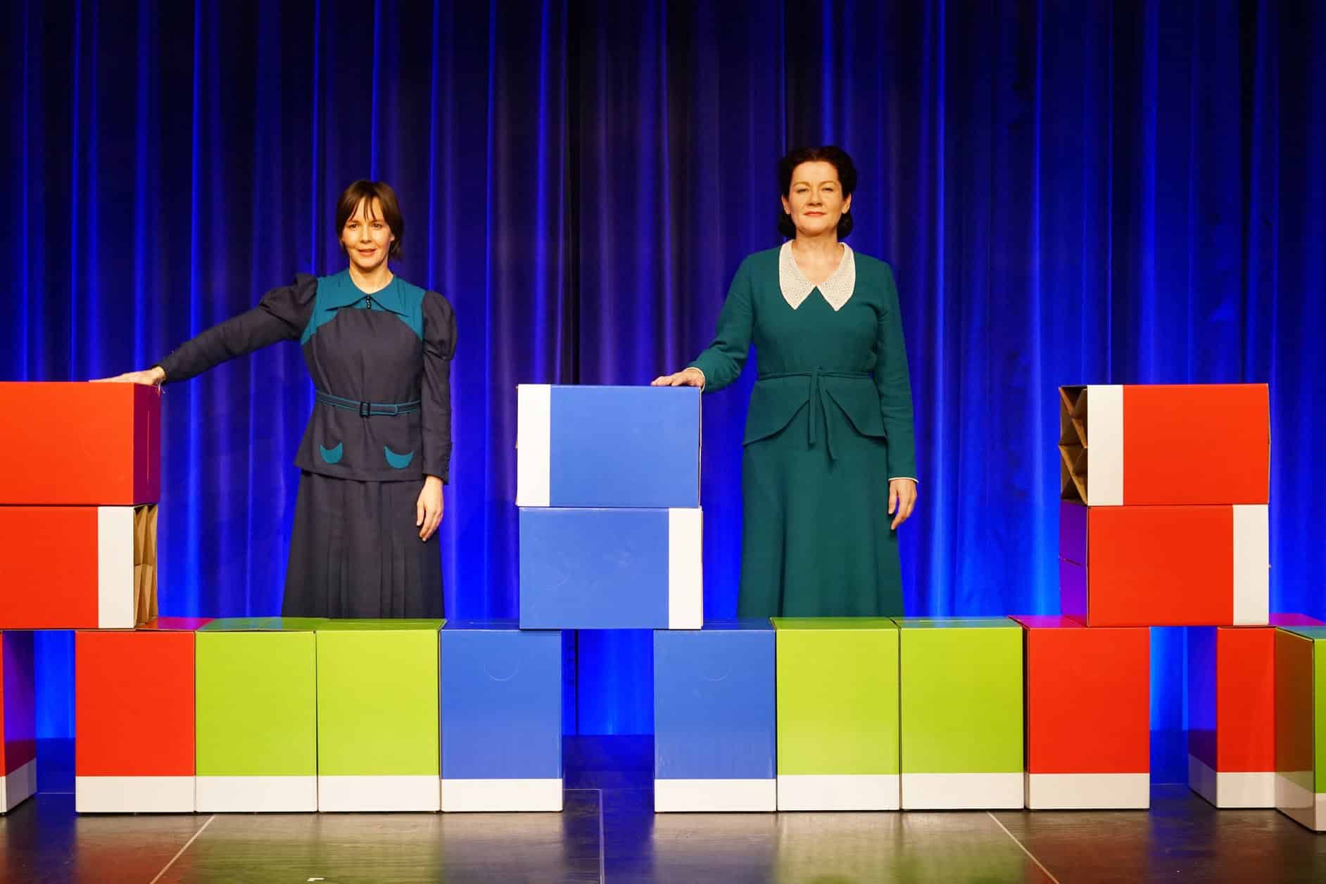 Mit einem unaufwändigen, aber höchst flexiblen Bühnenbild (Eva Maria Schwenkel) aus unterschiedlich färbigen Kartonkisten schaffen es die beiden Schauspielerinnen, die Szenerien ständig zu verändern. Da werden rote Schachteln zum Sinnbild für den immensen Gemeindebau-Boom der 20er Jahre. Vor und hinter blauen Papp-Kisten spricht Käthe Leichter über die Machtübernahme der Nationalsozialisten. An anderer Stelle schleppt eine „Arbeiterin“, offensichtlich von Rückenschmerzen geplagt, in einer Fabrik Boxen von einer Bühnenseite zur anderen.