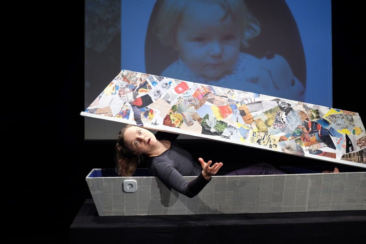 Mit bunten, aus Zeitschriften ausgeschnittenen Zettelchen ist er beklebt. Der Sarg, der mittig platziert, den Bühnenraum beherrscht. Ihm widmet sich Kirstin Schwab in ihrer One-Woman-Show gleich zu Beginn.