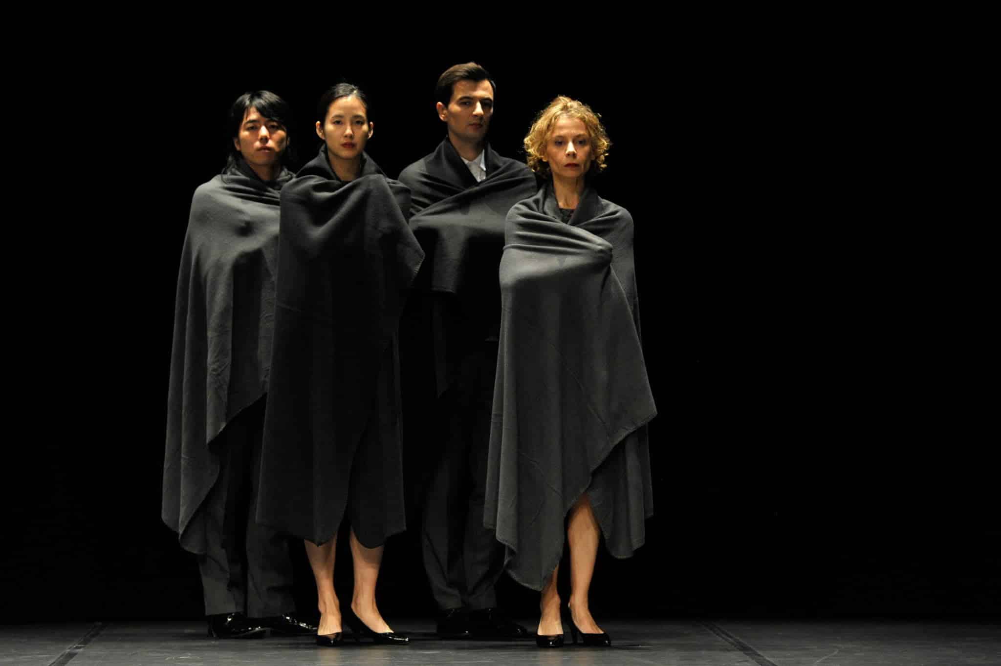 „Valse“ – der Titel von Raimund Hoghes neuem Stück steht aber nicht nur für Ravels Tonschöpfung, vielmehr ist er programmatisch für die Produktion gewählt. Tatsächlich sind – bis auf ganz wenige Ausnahmen – an diesem Abend ausschließlich Walzer zu hören. Und viele, ja beinahe alle, verbindet der Autor, Tänzer und Choreograf Hoghe mit Wehmut, Schmerz und Trauer. Marion Ballester, Ji Hye Chung, Emmanuel Eggermont, Luca Giacomo Schulte, Takashi Ueno und Ornella Balestra werden dazu mit grauen Decken ausgestattet. Dieses Kostümattribut wird zum Sinnbild für die angesprochenen Emotionen, aber auch zum Sinnbild für den Tod schlechthin. Über die Schulter geworfen oder darin eingehüllt, symbolisieren diese Decken den ersten Wärmeschutz nach der Errettung aus dem Meer. Sie stehen aber auch für die Trauer und jene Menschen, die nicht mehr unter uns sind. Abwesende, mit denen die noch Lebenden gerne tanzen würden.