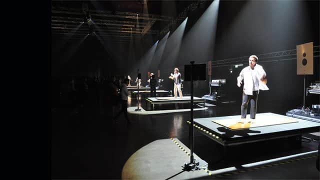 Der Saal des Semperdepots ist nur schwach erleuchtet. 12 niedrige Podeste, hinter denen jeweils elektronisch präparierte Pianos stehen, rhythmisieren den Raum. Das Publikum findet an diesem Abend keine Sitzplätze vor, sondern bewegt sich nach Lust und Laune im Raum. „Freie Platzwahl“ ist somit wörtlich zu nehmen. „Maschinenhalle #1“, so der Titel der Veranstaltung, tut ihrem Namen alle Ehre. Wer sitzt schon im Theatersessel in einer Maschinenhalle! Nachdem die 12 Tänzerinnen und Tänzer ihre Plätze auf je einem Podest eingenommen haben, markieren wenige harte Klavierakkorde den Beginn der Vorstellung. So, als wollten sie sich einzeln präsentieren, beginnt das Ensemble nacheinander auf den Kupferplatten, die auf den Podesten liegen und mit den Pianinos verkabelt sind, mit seinen Schrittkombinationen. Und jeder dieser Schritte löst Klavierklänge aus. Oder tanzen sie zu der elektronisch gesteuerten Musik?