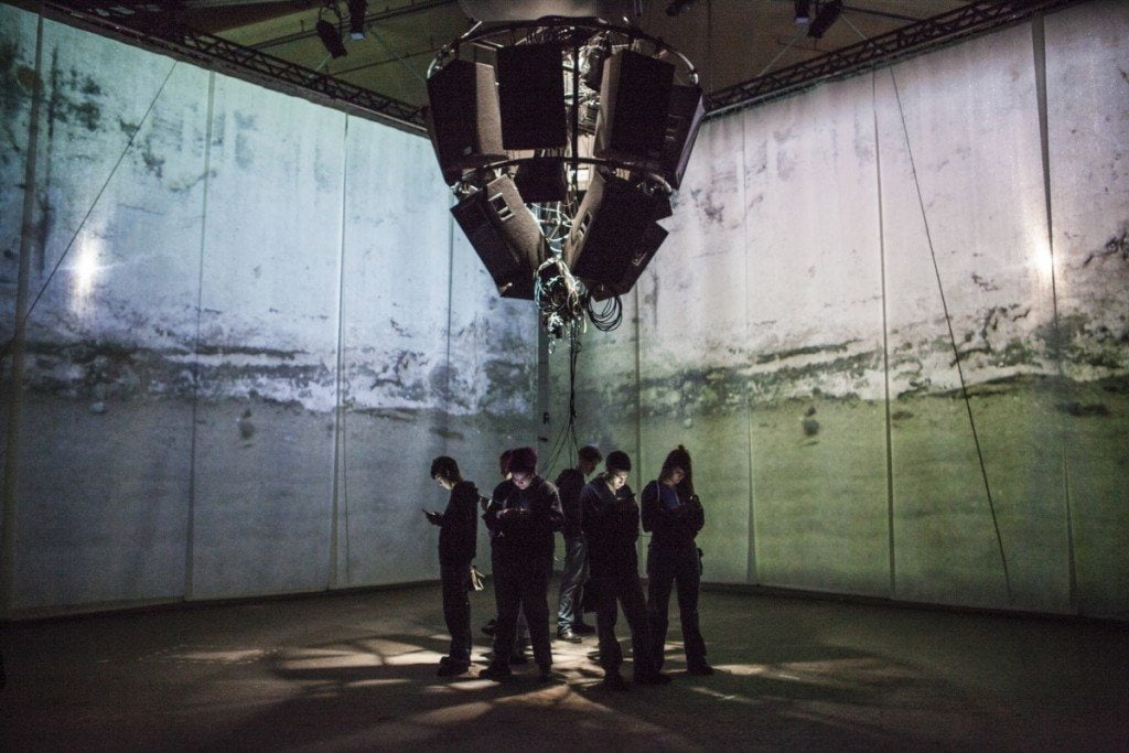 Von der Hallendecke hängt eine Agglomeration von großen Lautsprechern aus der gleich zu Beginn „Noise“ ertönt. Viele Zuschauerinnen und Zuschauer greifen zu den angebotenen Ohrstöpseln, aber es ist lediglich die Eingangs- und die Ausgangspassage, welche diese notwendig machen. Wie auf Kommando verkabeln die jungen Leute, die sich im Kreis unter den Lautsprechern aufgestellt haben, ihre Handys und bedienen diese, während die Displays im Dunkeln leuchten.