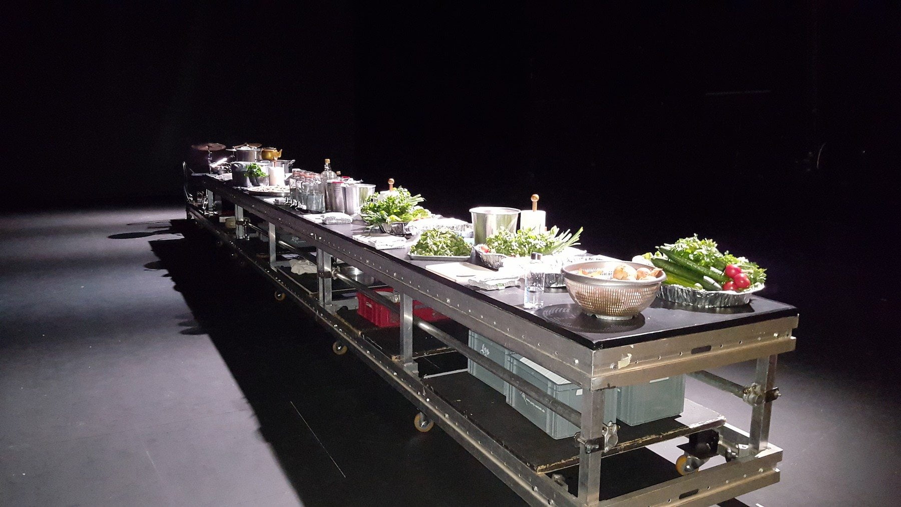 Es riecht nach Essen. Nach Zwiebeln, nach Kräutern. Der meterlange Tisch steht inmitten des Raumes, vollbepackt mit großen Schüsseln, Gemüse, Messern, Schneidbrettern, Ölflaschen. Offenbar wird gekocht werden. In der Halle G, die das Tanzquartier nutzt. Eine Kochshow?