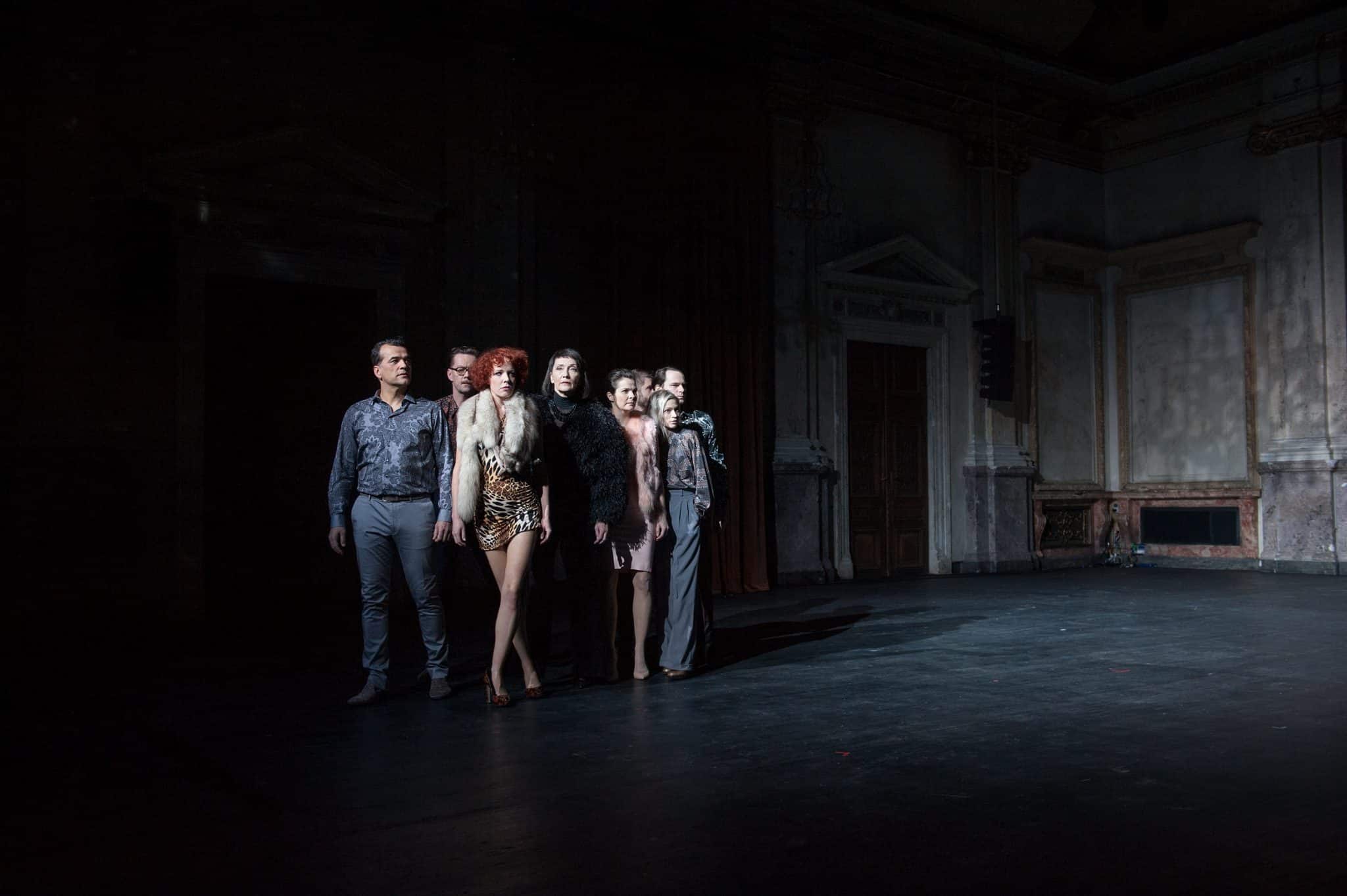 In den nächsten drei Durchläufen verändert sich die visuelle Wahrnehmbarkeit des Geschehens drastisch. Gibt es im zweiten ein Gedränge um die besten Plätze auf dem Podium, müssen sich im dritten Teil alle darunter wie in einem Bunker zusammenpferchen. Doch selbst dieser Unterschlupf bleibt kein gesichertes Terrain. Am Ende robbt die feine Gesellschaft aus ihrem Versteck, um die Bühne durch einen Seiteneingang schließlich ganz zu verlassen.