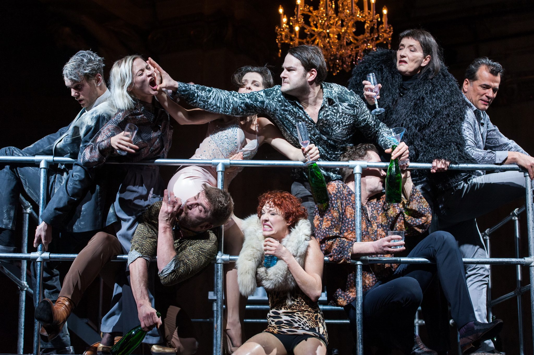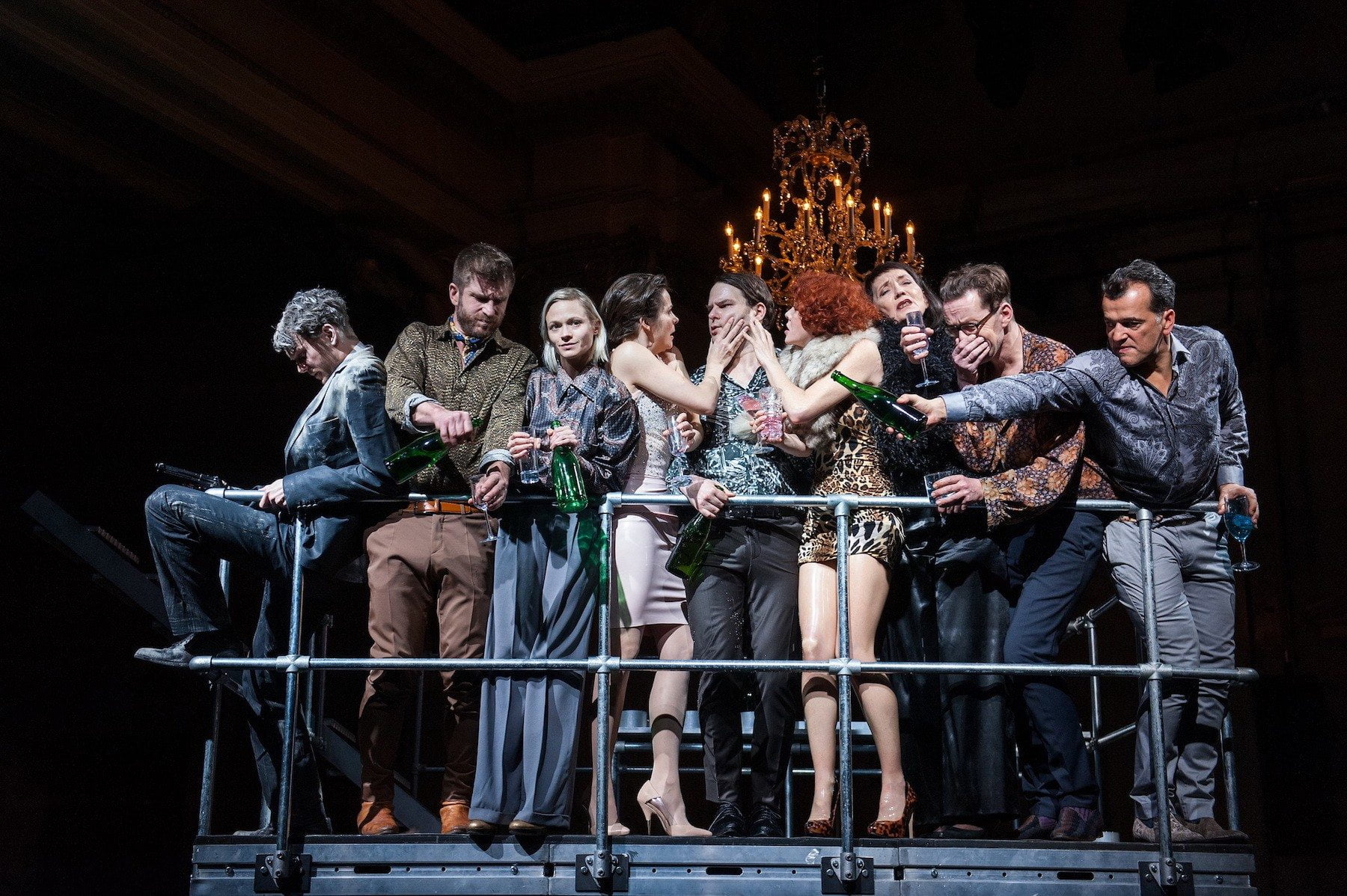 Lolić greift zu einem dramaturgischen Trick, um das für eine Bühne extrem kurze Geschehen auf 1 Stunde und 15 Minuten auszudehnen. Insgesamt vier Mal hintereinander darf das Ensemble den Pinter-Text spielen, in jeweils verändertem Setting, mit immer kürzer werdenden Statements. Zu Beginn jedoch schleichen die Schauspielerinnen und Schauspieler wortlos in einem Pulk quer über die Bühne, das Publikum beinahe ängstlich oder argwöhnisch im Visier. Darauf folgt eine atemraubende Tanzsession zu harten Techno-Trance-Beats, bevor die davon Ausgepowerten ihr Bühnenbild – eine Podest-Konstruktion aus Aluminium – gemeinsam ins Blickfeld schieben. Diese erst einmal erklommen, beginnen sie mit der Deklamation von Pinters Text, in dem er nicht nur die einzelnen Befindlichkeiten dieser Menschen aufzeigt. Er lässt auch, durch Randbemerkungen angedeutet, durchblicken, dass sich außerhalb des Partygeschehens in der Stadt, die keinen Namen trägt, wohl Schreckliches abspielt. Von Barrikaden ist da kurz die Rede, von Soldaten, die patrouillieren, sogar vom Schwarzen Tod. Während aber draußen offenbar das große Sterben angesagt ist, zumindest jedoch eine politische Willkür waltet, wird drin ausgelassen gefeiert. Der Luxus im dem geschwelgt wird, wird durch einige Kronleuchter markiert, die im Laufe des Abends jedoch erlöschen. (Bühne Sabine Kohlstedt)