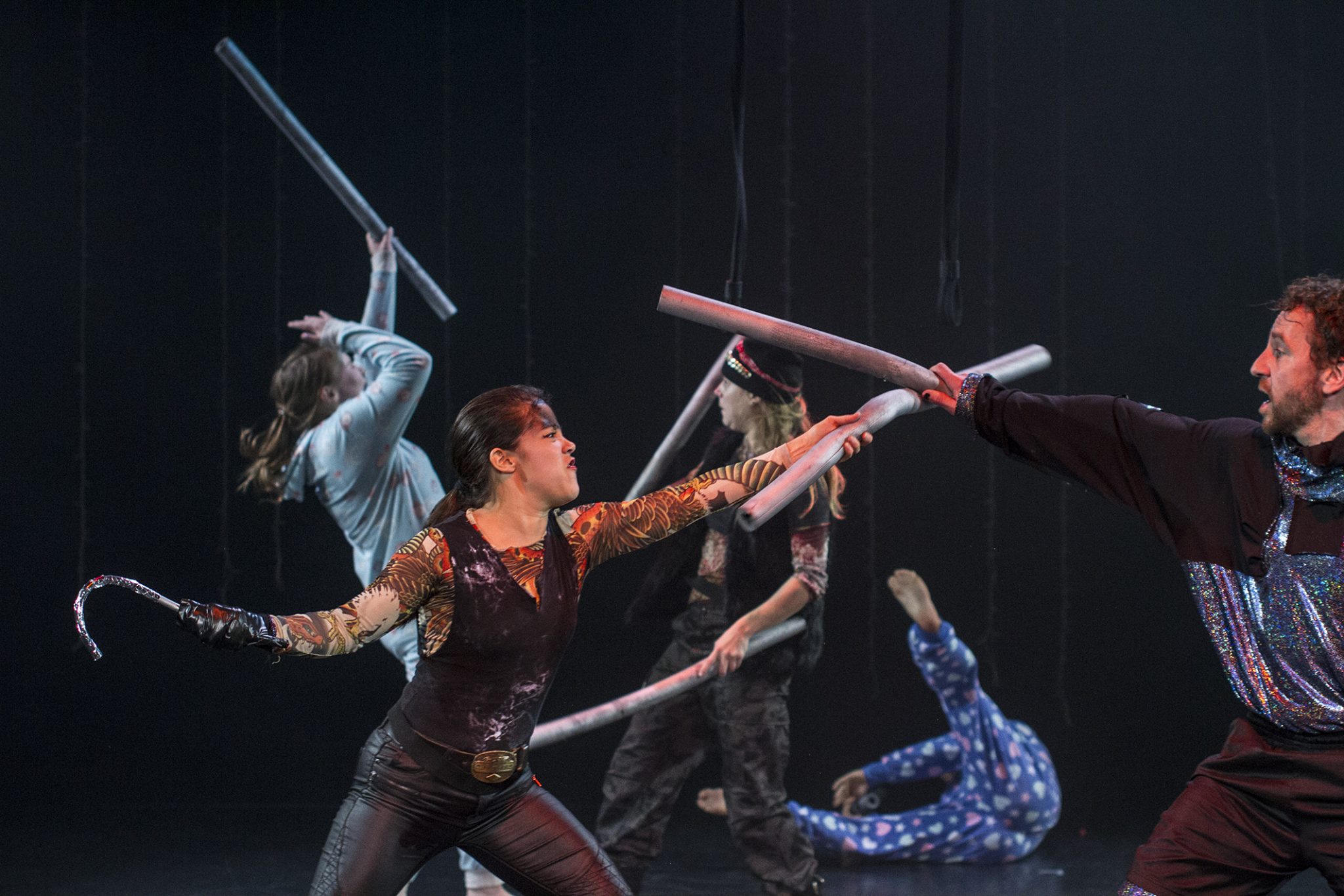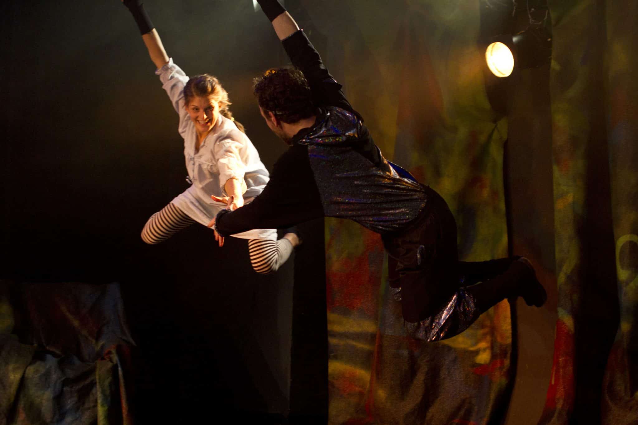 Schön eingebaut sind die musikalischen Szenen und die Tanzeinlagen, die sich ganz organisch einfügen. Ein klein wenig runder könnten manche Szenenwechsel gestaltet sein. Dass die Emotionen auch wirklich überschwappen, hört man, wenn zum großen Showdown auf den Rängen getrampelt wird, was das Zeug hält. Oder unisono mit den Zungen geschnalzt, als es gilt, das Krokodil anzukündigen, das Kapitän Hook an den Kragen will. Zuvor jedoch muss Glöckchen – einfach hinreißend und umwerfend von Steffie Jöris gespielt – noch durch alle emotionalen Hoch und Tiefs durch, die eine Freundschaft mit Peter so mit sich bringt. Wie nebenbei lernt man, dass man Freunde ruhig auch teilen kann. Jörris nonverbales Spiel mit ihren ungestümen Bewegungen bezaubern nicht nur vom ersten Augenblick, sondern bringen auch viele Lacher mit sich. Maartje Pasman wiederum beeindruckt vor allem als kämpfender Hook, der nicht nur auf der Bühne mit seiner Hakenhand bedrohlich aussieht, sondern sich mit Peter Pan auch auf der Treppe im Zuschauerraum ein Gefecht liefert.