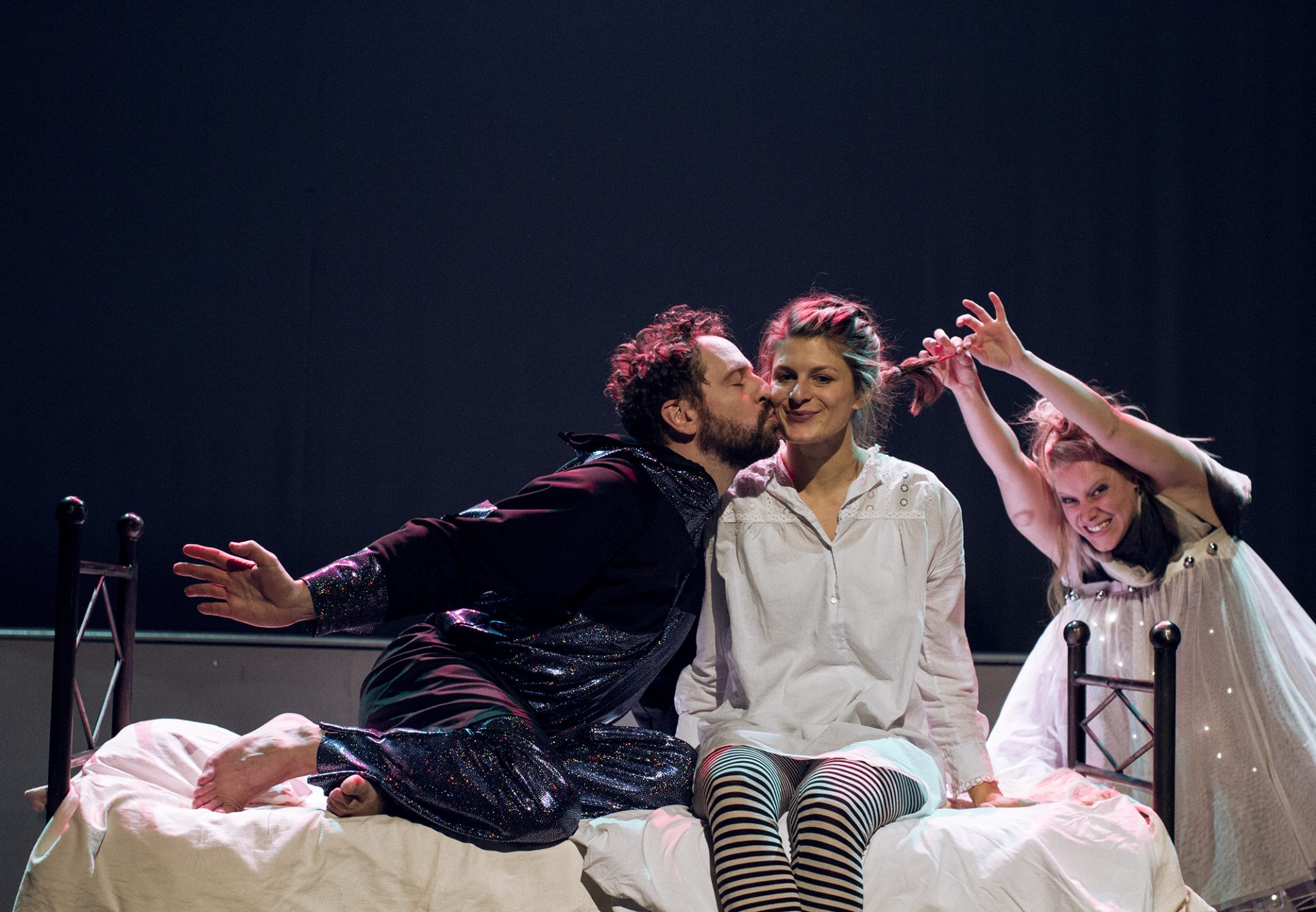Die allseits bekannte Geschichte um jenen Jungen aus dem Nimmerland, der nicht und nicht erwachsen werden will, wartet mit einem tollen Ensemble auf. Einige Darstellerinnen und Darsteller sind in Mehrfachbesetzungen zu sehen, die von den Kindern wahrscheinlich gar nicht wahrgenommen werden, so fein schlüpfen sie in die unterschiedlichen Rollen. Die Regisseurin Julia Burger setzt nicht auf ein großes Bühnenbild mit grellen Kostümen, sondern vielmehr auf ein pralles Spiel und Phantasie beim Zuschauen. Da wird der Weg ins Heim der Lost Boys (Viviane Podlich und Rino Indiono) zur Kletter- und Fahrstuhlpartie ohne Requisiten und auch die Insel selbst und das Schiff, mit dem Hook unterwegs ist, gibt es nur in der eigenen Vorstellung. Aber der bunte Sternenhimmel, der nach der ersten Szene sichtbar wird, entlockt dem jungen Publikum ein bewunderndes „wow!“ Geschickt schweben vor ihm Peter (Sven Kaschte in schwarz-silbernem Overall) und Wendy (Mira Tscherne) an dicken Gummigurten durch die Lüfte.