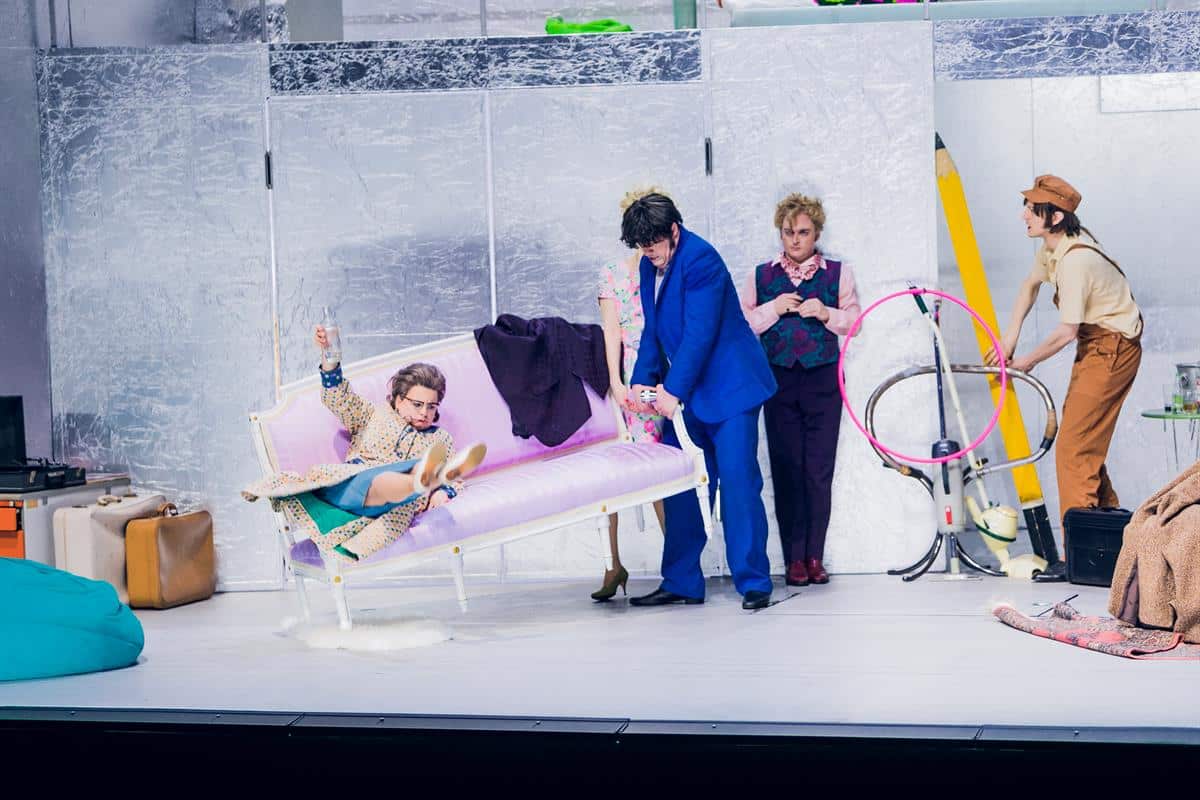 Der Regisseur Christian Brey unterstützt diese dramaturgisch schon höchst ausgefeilte Szenerie noch durch jede Menge Slapstick, die zum größten Teil von Thomas Frank in der Rolle des erfolglosen Künstlers Brindsley getragen wird. Frank hat am Volkstheater die komödiantischen Rollen gebucht und beeindruckt vor allem durch seinen körperintensiven Einsatz auf der Bühne. Dabei legt er einen stuntreifen Treppenabgang hin, stolpert halsbrecherisch über Möbel, stranguliert sich beinahe am Kabel einer Stehlampe und verliert ungeschickt immer wieder das Gleichgewicht bei der Handhabung von monströsen 60er-Jahre-Sitzsäcken.