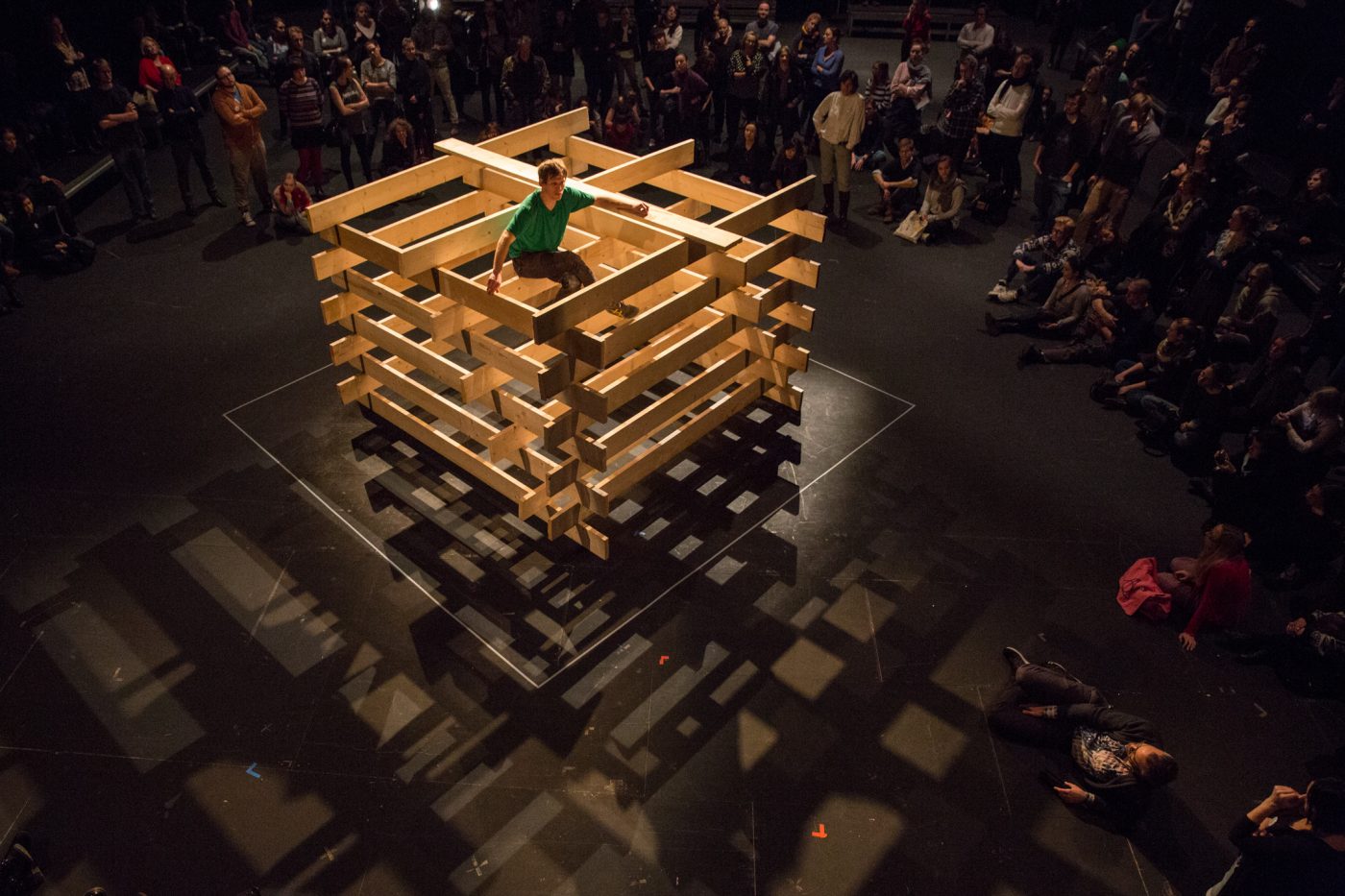 Wenige Augenblicke später, nachdem der Tänzer sich unter der Saalbarrikade durchgewunden hat, rollt das Tor auf, sodass auch das Publikum eintreten kann. Ein großer Bretterverschlag steht im vorderen Saalbereich, den Willems mühselig zu erklettern versucht. Zuerst, ohne seine Beine benutzen zu können, dann gewinnen seine Beinmuskeln an Kraft und er geht in den menschlichen Zustand des „Sich-aufrecht-Fortgewegens“ über. Nun gilt es, die Bretterbude Schritt für Schritt nach oben zu erklimmen. Dort einmal tatsächlich angekommen, beginnt er Nietzsches Text zu rezitieren. Nicht auf Deutsch, sondern in Willems Muttersprache Englisch. „Wir haben versucht, wie es sich anhört, wenn Frank den Text auf Deutsch sagt, aber davon sind wir abgekommen. Es wäre eine eigene Sprache gewesen, die so nicht funktioniert hätte“, erläuterte Peter Stamer bei einem Interview.