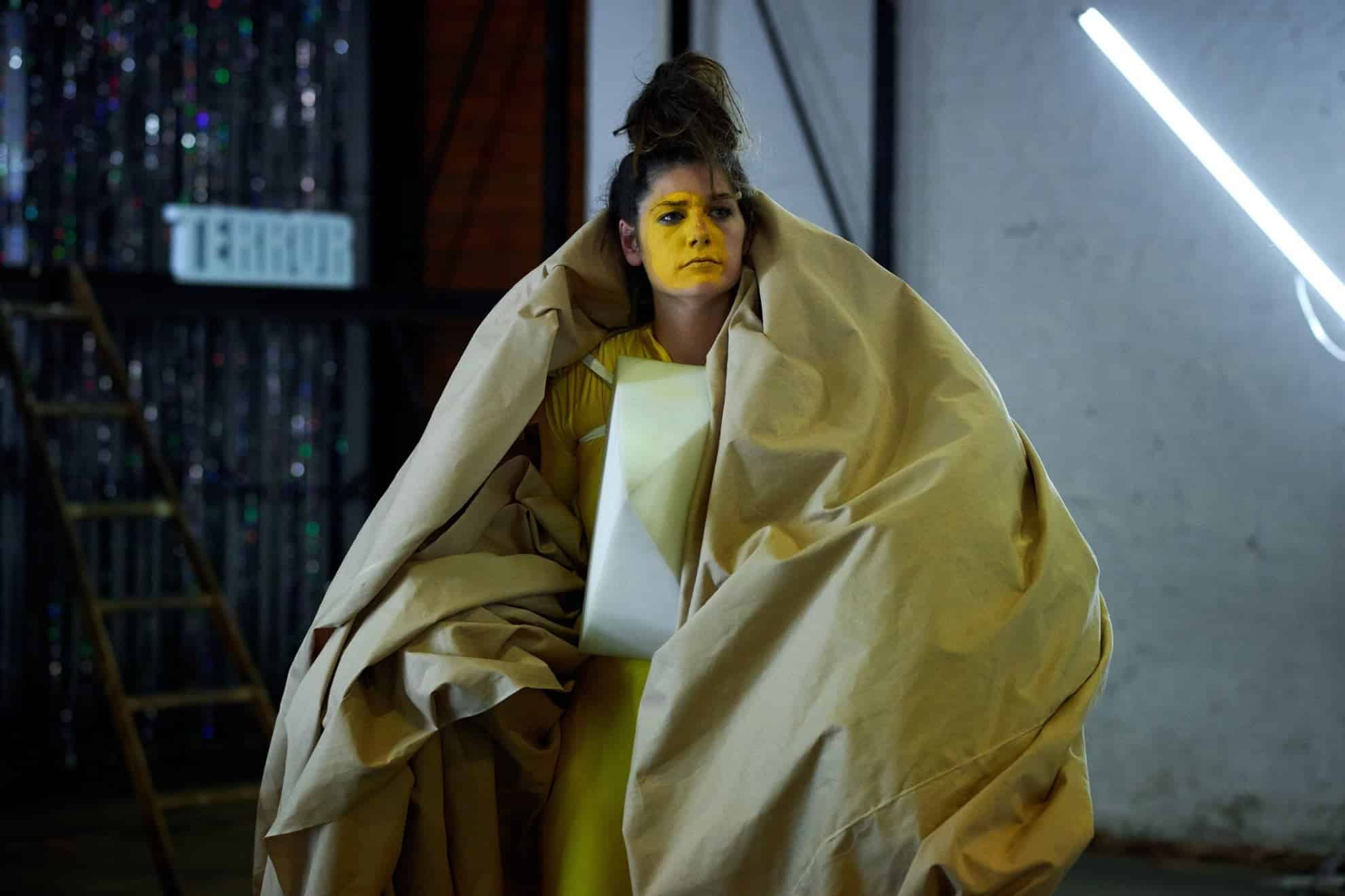 Das Poem-Kostüm erinnert ein wenig an die Vorbilder aus dem Triadischen Ballett, Sponge Bob stand wohl Pate für „Hate Crime“, der „Terror“ trägt einen bedrohlichen, schwarzen Balken über dem Kopf und das Schwefelgelb des Trikots von „Madness“ wächst der Darstellerin bis in ihr Gesicht hinein. (Kostüme Marco Tölzer) Wie immer bei den Produktionen des theatercombinats befinden sich die Zusehenden mittendrin im performten Alltagswahnsinn.
