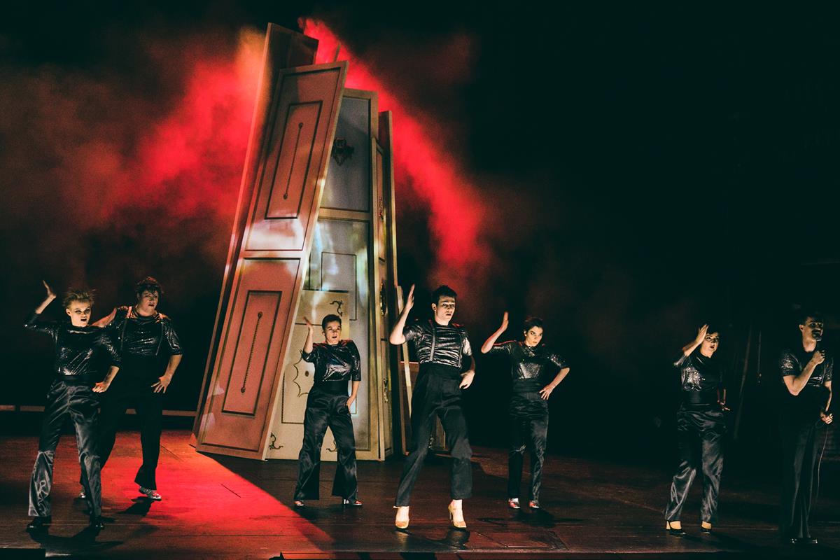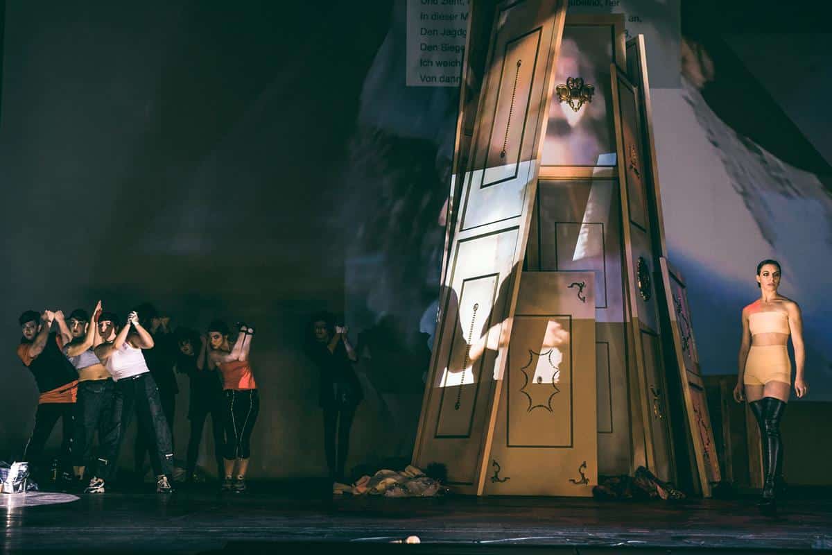 Die in der Mitte der Bühne aufgestapelten, barocken Türen (Bühne Paul Lerchbaumer) künden von der späteren Brandschatzung des Schlosses durch die russische Besatzung. Die sphärische Hauptkomponente erhält der Abend jedoch durch die Lichtgestaltung von Paul Grilj. Er taucht den Bühnenraum in helles Blau und Grün und leitet mit einem dunklen Orange den grausamen Erzählhöhepunkt ein.