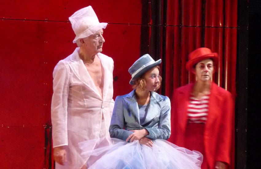 Das Geschehen rund um Olivia, die ihren Bruder betrauert und sich unversehens in die als Mann verkleidete Viola verliebt, die ihrerseits ebenso um ihren Bruder trauert, von dem sie annimmt, er sei ertrunken, hat bei Rabeux exakt dieselben skurrilen Höhen, schillernden Zwischentöne aber auch nachdenklichen Passagen, wie William Shakespeare sie in seiner Urfassung angedacht hat. Obwohl es kein zwitschernderes Grün, kein blitzenderes Blau und kein schreienderes Gelb gibt, in das Rabeux seine Protagonisten gewandet. Obwohl der hünenhaft gewachsene Gilles Ostrowsky als Sir Andrew (im Deutschen Andreas von Bleichenwang) durch seine umwerfende Komik bei jedem seiner Auftritte das Publikum zu Lachern hinreißt. Er besticht nicht nur durch seine Körpersprache, sondern vor allem durch seine grenzenlos aussagestarke Mimik, die bis in die letzte Reihe wahrnehmbar ist. Obwohl Feste, der Hofnarr, alleine schon durch seine groteske Aufmachung mit weißen Gummistiefeln, weißem, durchsichtigen Möchte-Gerne-Zylinder und weißem Frack, unter dem er nichts als eine weiße Feinrippunterhose trägt, eine so komische Gestalt abgibt, dass sein Äußeres jeden seiner gesprochenen Einsätze überstrahlt. Georges Edmonts strahlend weiße Haare passen dazu wie das Tüpfelchen auf dem i. „Obwohls“ wären noch einige anzuführen, die belegen, dass das Publikum bei dieser Inszenierung mit einer ganzen Menge subtilem, aber auch handfestem Witz unterhalten wird. Mitleid, Verwunderung und Nachdenklichkeit gehen dennoch nicht verloren und machen tatsächlich das Salz in der so überaus heißen Lachnummernsuppe aus.