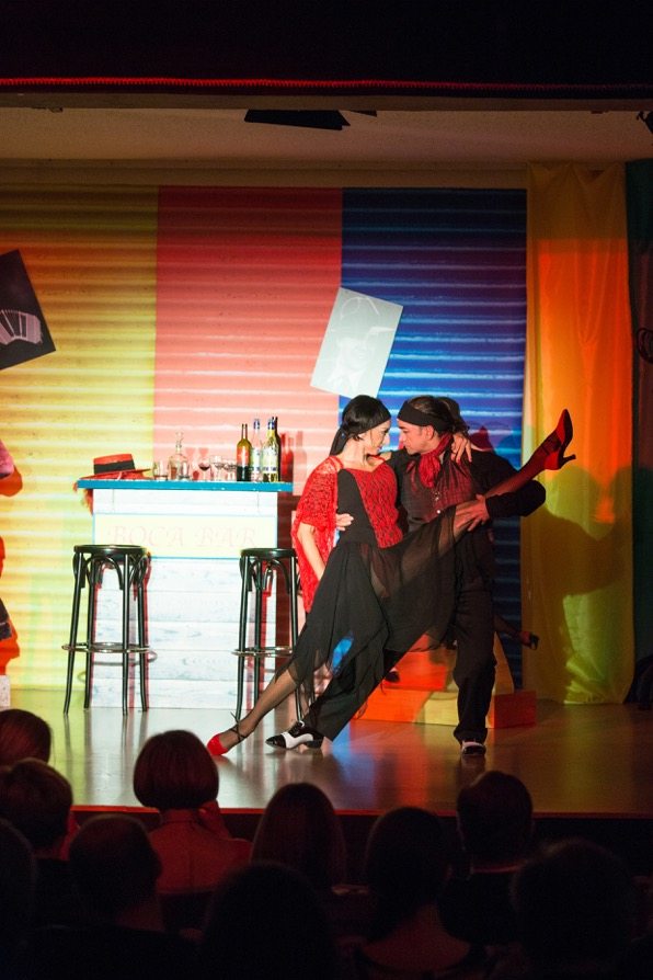 Das tolle Ambiente der Eden Bar gibt, abgesehen von der dem Stück nicht zuträglichen Faschings-Deko (Luftschlagen hängen von den Wänden, teils überdimensional große und bunte Ballons von der Decke) einen passenden Rahmen für die Geschichte. Etwas irritierend ist Monica Arnós lebhafte Performance ohne den vielleicht wünschenswerten, dazu passenden südländischen Akzent in der Sprache. Die Authentizität des Abends hat auch unter den stellenweise etwas zu trashigen Kostümen gelitten. Alles in allem ergänzen sich jedoch Sprache, Gesang und Tanz einander wunderbar und fügen sich zu einer liebenswerten Tango-Revue, bei der das Publikum auch nicht zu kurz kommt. Immer wieder können Zuseher auf die Bühne, um selbst das Tanzbein zu schwingen. Ein humorvoller, kurzweiliger Abend, bei dem man ganz nebenbei auch Interessantes zur (Entstehungs-)Geschichte des Tangos erfährt.