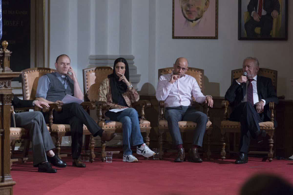 Die Aula der Karl Franzens Universität bot für „The Iran Conference (2018)“ von Ivan Vyrypaev (Text und Regie) ein ideales Setting. Der in Russland geborene Schauspieler, Regisseur und Dramatiker lebt heute in Polen. Die Ausgangslage der Theaterproduktion: Eine Konferenz, die in Kopenhagen stattfindet und sich dem Thema Iran widmet. Das Publikum schlüpft dabei in die Rolle der Konferenzbeobachtenden und wird Zeuge nicht nur unterschiedlicher Zugänge zum Thema Islam versus westliche Gesellschaftsideologien. Vielmehr kommt es vor allem in der zweiten Hälfte der Aufführung zu Selbstoffenbarungen, die mit dem Terminus Seelenstriptease gut umrissen sind.