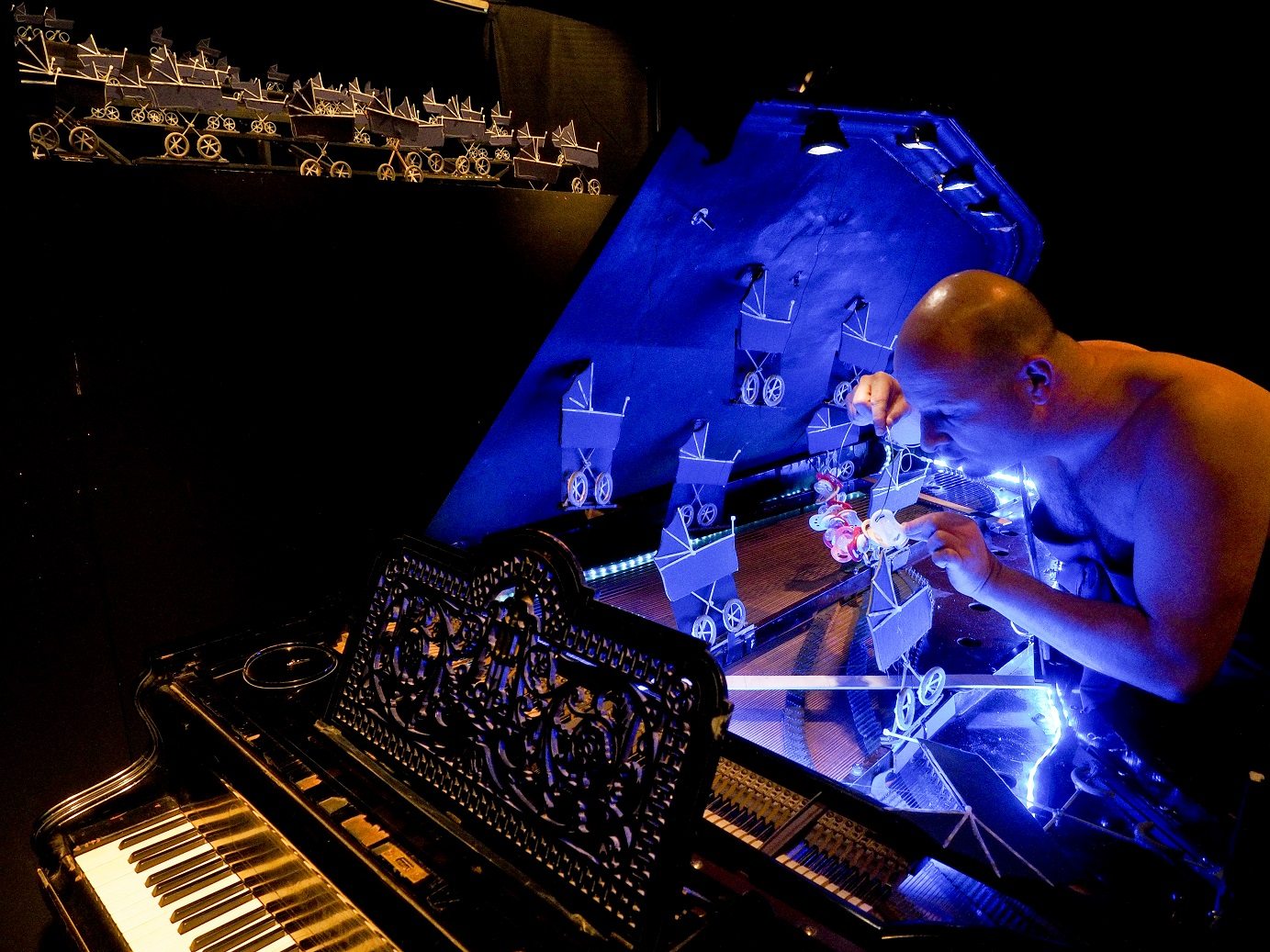 Im Kabinetttheater, bekannt für sein Puppenspiel vor und hinter der schwarzen Wand mit den vielen Guckfenstern, agieren dieses Mal jedoch auch Menschen in Fleisch und Blut – sichtbar vor der Bühne. Ulla Pilz gleich in vier Rollen: Sie spielt bzw. singt die Therese, den Tiresias, den Sohn und die Wahrsagerin. Bartolo Musil reicht aufgrund der wahnwitzigen Kinderschar von 40.050, die er alleine zeugt und gebiert, eine einzige Rolle. Neben seinen Erziehungsaufgaben hat er noch alle Hände voll zu tun, um sich selbst und Ulla Pilz am Klavier zu begleiten. Einfach zauberhaft, wie sich eine ganze Kinderwagen-Armada aus dem Klavier und auf der kleinen Bühne dahinter formiert. (Bühnenbild und Kostüme Julia Reichert und Christian Schlechter). Köstlich auch der Einfall, Theresia, respektive die Wahrsagerin als „Frau ohne Unterleib“ erscheinen zu lassen. Maria Frodl spielt am Cello und betätigt auch eine singende Säge. Eine wunderbare und sehr kluge Idee, wurde dieses Instrument doch gerade um die Zeit der Uraufführung des Stückes, 1917, in Europa richtig modern.