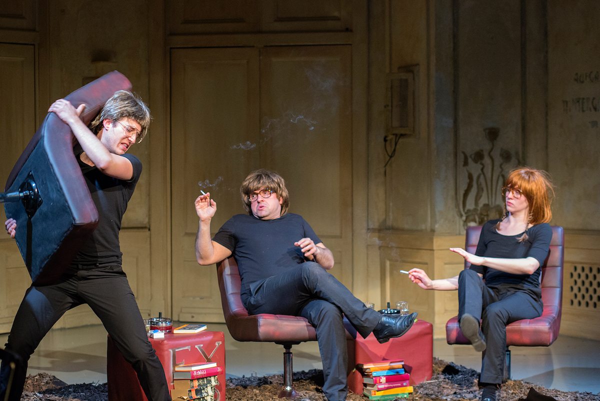 Martin Schwanda, Jan Nikolaus Cerha und Saskia Klar wechseln in Sekundenschnelle auf offener Bühne ihre Rollen. Die Idee, das Bühnenbild aller Szenarien permanent sichtbar zu lassen, korreliert mit dem Gedanken, dass sich die Ereignisse nicht nur überschneiden und bedingen, sondern auch jederzeit wiederholen können. Die hitzige Fernsehdebatte, die sich die drei liefern, gerät zu einer unglaublichen Lachnummer. Cerha mimt dabei einen Kritiker, der sich gegen jede Art von Establishment verwehrt, aber doch nur in demselben bestehen kann. Sein Wutausbruch erinnert verblüffend an jene von Klaus Kinsky. Schwandas Interpretation des Moderators, der sich zwischen den Fronten des Kritikers und der Historikerin findet, ist ein komödiantisches Meisterstück. Klar verliert nach einer langen Phase der Contenance schließlich ihre Nerven und deckt mehr unfreiwillig als bewusst, ihre ehemalige Beziehung zum Literaturkritiker auf. Junod schafft mit der Darstellung eines kurzen historischen Moments, in dem das Vergangene gerade noch als Belastung zu spüren ist, das Zukünftige aber noch weit weg scheint, eine wunderbare Metapher auf unbeschwerte Friedenszeiten.