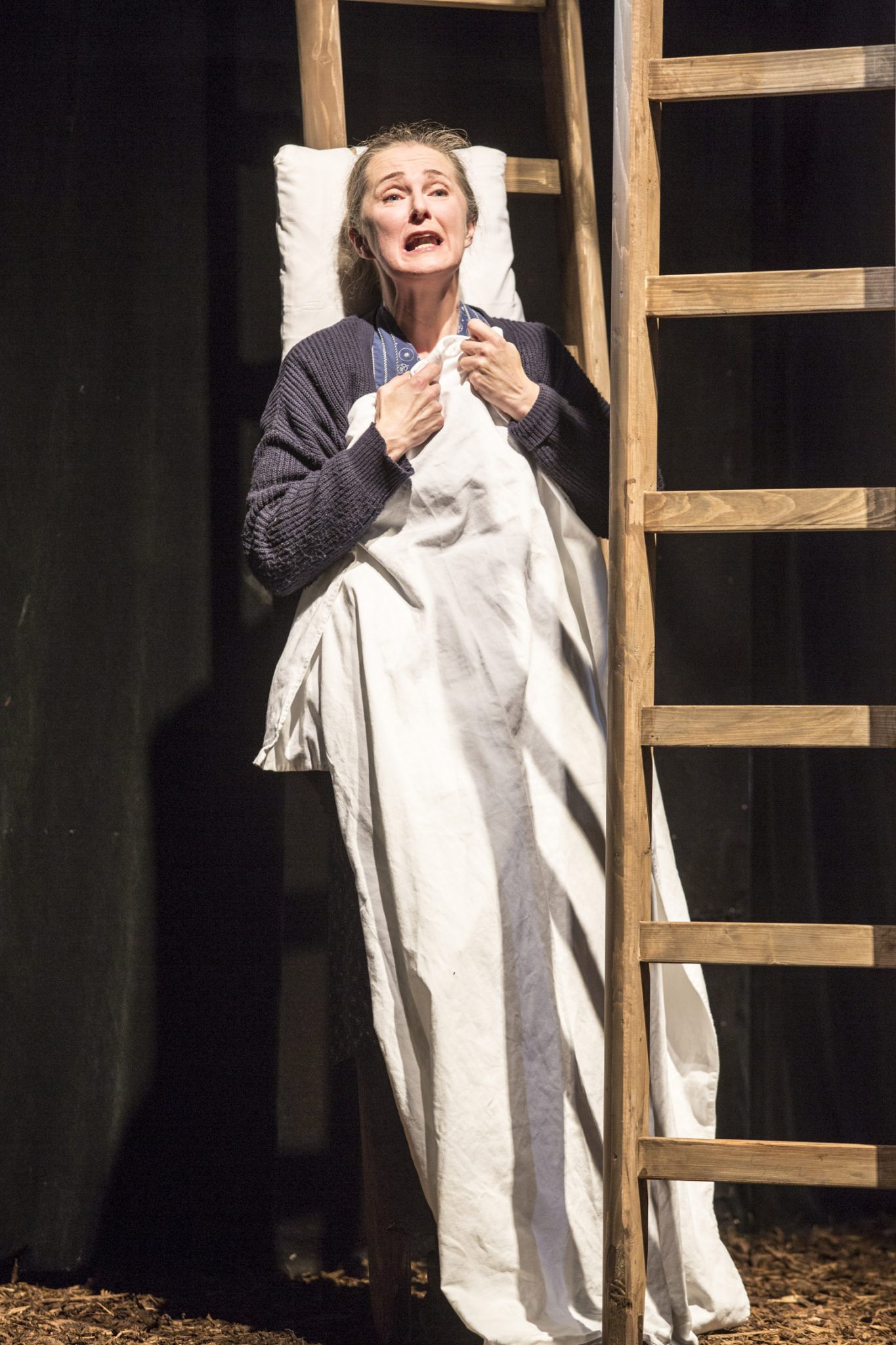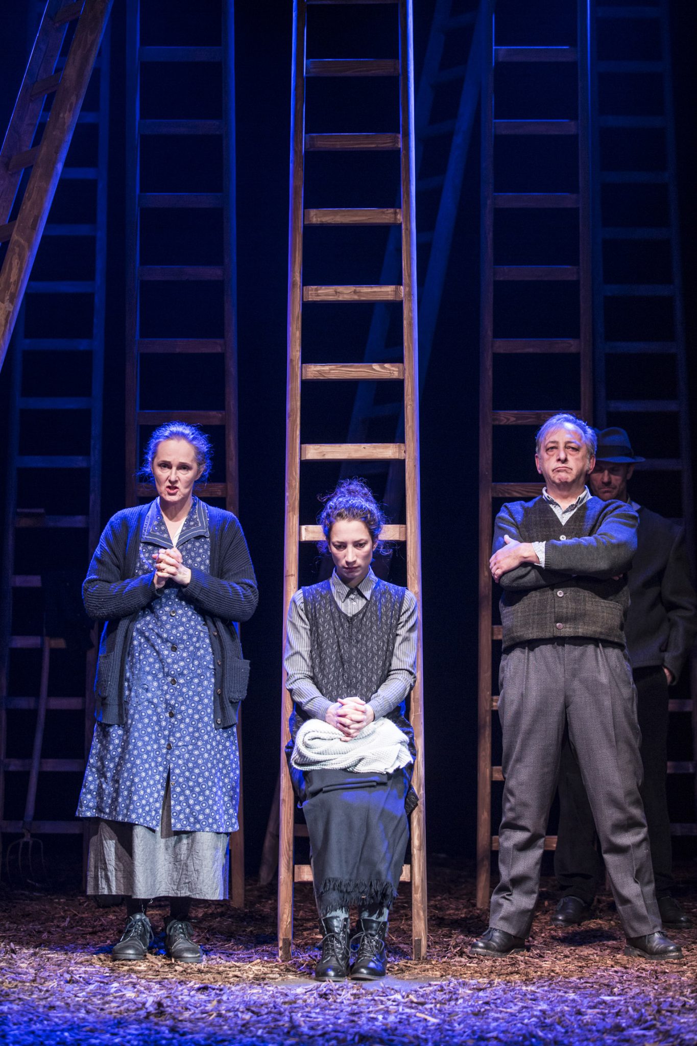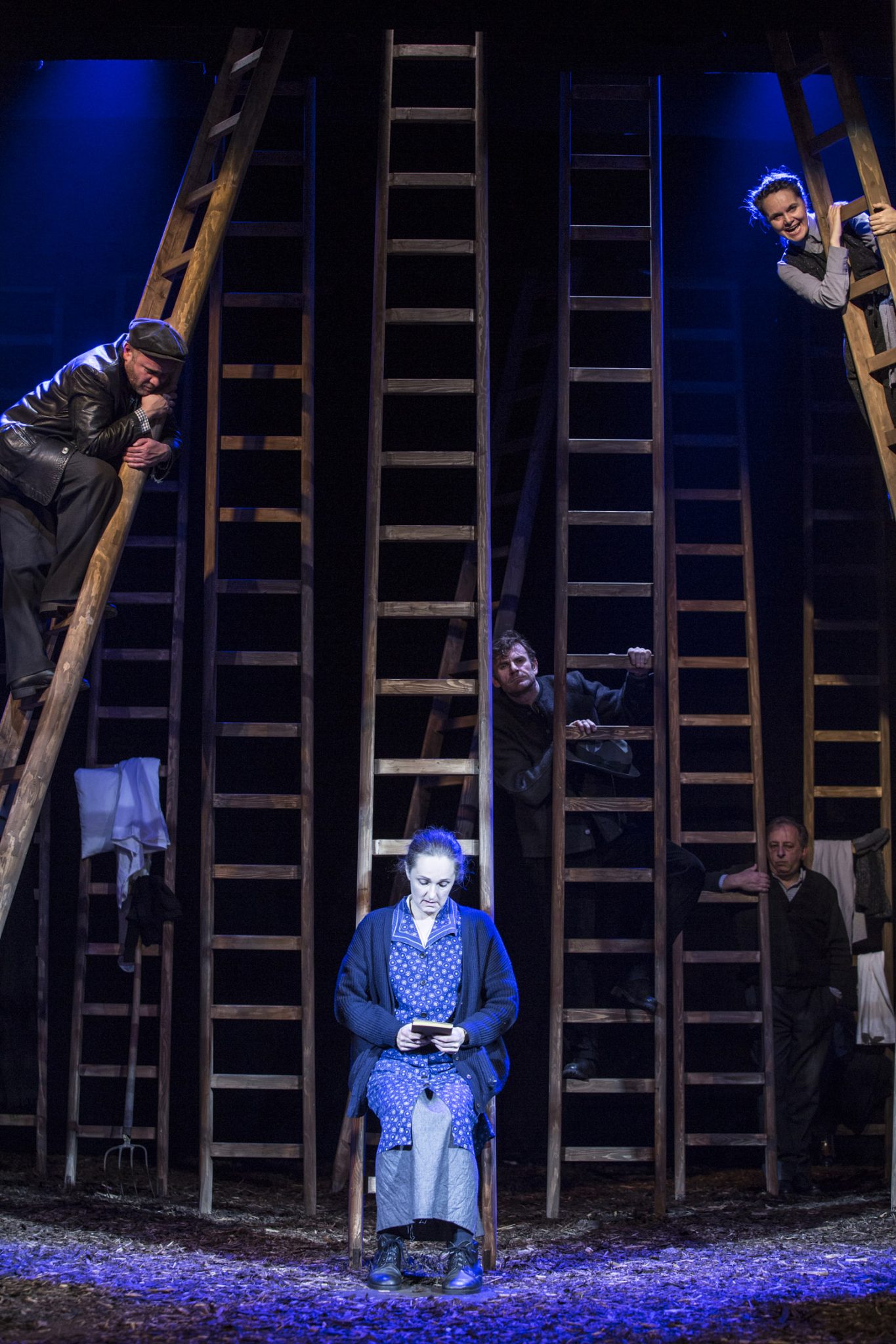 Sechs Menschen wurden auf einem Bauernhof brutal abgeschlachtet. Bauer und Bäuerin, die Tochter und ihre beiden Kinder sowie eine Magd. Wie es dazu kam, erfährt man in einer Inszenierung von Rüdiger Hentzschel. Dieser schafft mit einer höchst kunstvollen Taktung des Geschehens einen Spannungsbogen von der ersten bis zur letzten Minute. Ganz idyllisch lässt er das Stück mit einem 8-stimmigen Jodler beginnen. Wohl fühlt man sich dabei aber trotzdem nicht, zu herb ist das ebenfalls von Hentzschel verantwortete Bühnenbild. 20 Leitern sind auf der Bühne angeordnet, ein unüberblickbares Gewirr von Holzstangen, gebettet auf stark duftendem Rindenmulch.