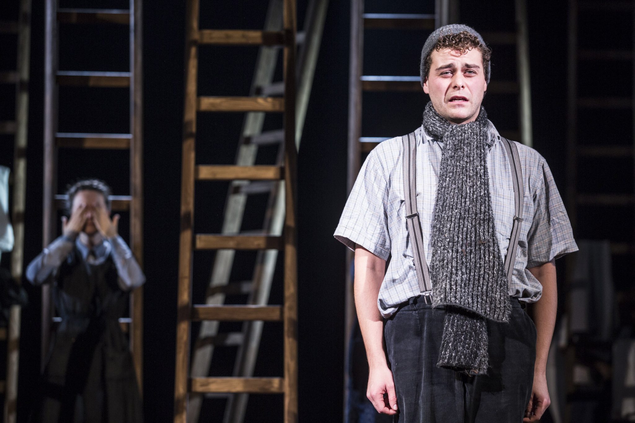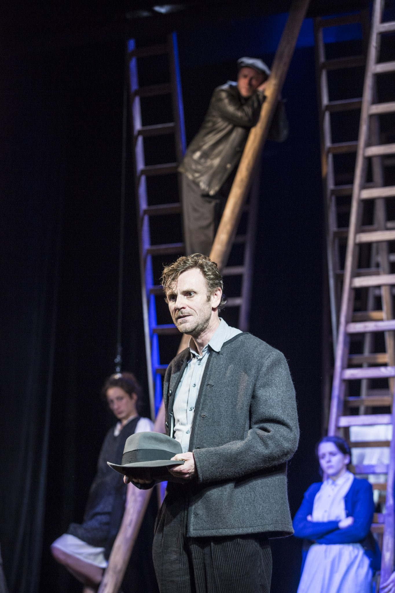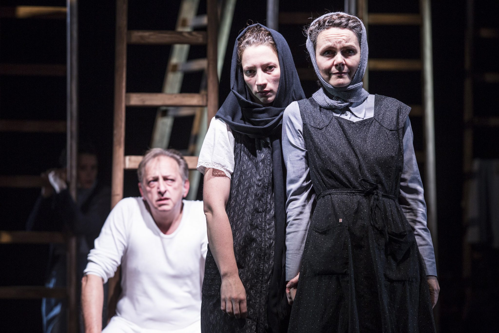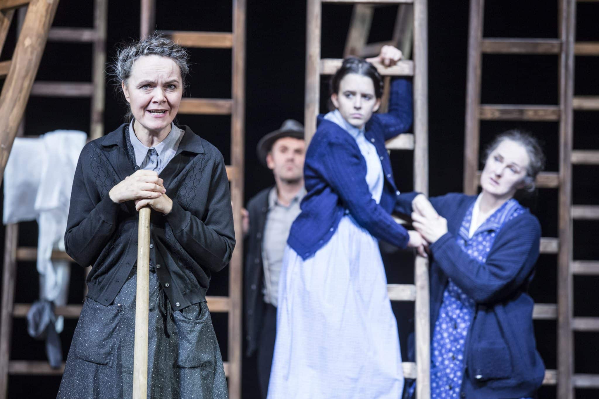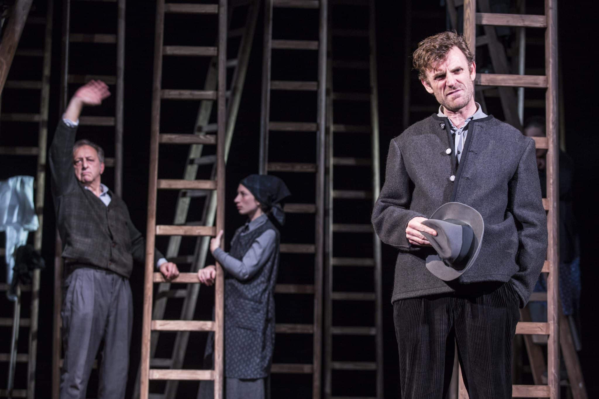 Was zu Beginn gezeigt wird, ein Gesang und eine Gebetslitanei, erweist sich als kluger Regiegriff, mit dem höchst kunstvoll die einzelnen Szenen in weiterer Folge voneinander getrennt werden. So kann das Publikum, ohne jegliche Umbauten, die unterschiedlichen Orte und Handlungsstränge voneinander unterscheiden. Auf diese Weise wird ein- und dieselbe Bühnenausstattung zur Stube des Dannerhofes, zum Dachboden desselben, zum Haus des Bürgermeisters oder des Pfarrers und zur Kirche, in der gemeinsam der Rosenkranz gebetet wird. Eine Herausforderung dennoch für die Schauspielerinnen und Schauspieler. Wenn sie nicht gerade an der Reihe sind, müssen sie auf die Leitern klettern oder sich dahinter, so gut es geht verdeckt, vom Geschehen fernhalten.