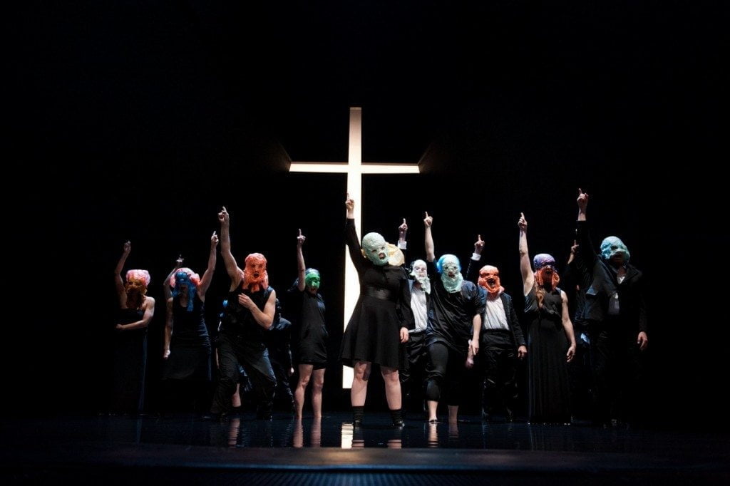 Die Menschen, die sich schließlich alle aus dem Nass erhoben haben, gruppieren sich und beginnen unisono zu sprechen. Es ist ein Chor der Überlebenden aber Rechtlosen und Dahinvegetierenden. Ein Chor, aus dem sich hin und wieder einzelne Stimmen lösen. Es sind keine No-names, die hier die Namenlosen spielen, sondern gestandene und bekannte Schauspielerinnen und Schauspieler, die in der Gruppe aufgehen und ihre Individualität verlieren. Nur selten dürfen sie zusammenhängende Textpassagen rezitieren, oft auch nur kleine Wortschnipsel einbringen. Sie erzählen als Flüchtlinge von den Gräueltaten in ihrer Heimat, von Enthauptungen, festgehalten auf Smartphones, von Zurückweisungen und bürokratischen Hürden in diesem unbekannten Land, an denen man per se schon zum Scheitern verurteilt ist. Das Schreckliche, das sie hinter sich haben und das sie fliehen ließ, ist hier irrelevant: „Die Toten gelten nichts und sind nichts“. Sie klagen an, stellen fest, bitten, flehen, fluchen und schimpfen. Aber nichts davon hilft ihnen, ihre Situation zu verbessern. Nach und nach, setzen sie ihre Plastikmasken ab, die sie bis dahin unkenntlich machten. Ein Nachhall der antiken Theaterpraxis in die Jetztzeit übersetzt und auch in Zusammenhang mit der kirchlichen Konnotation ein starker optischer Verweis auf Pussy Riot. Nun zeigen sie ihre Gesichter und damit auch ihre Persönlichkeit, die jedoch nur in kurzen Momenten an Konturen gewinnen. Dann, wenn sie vortreten und über ihre Einzelschicksale erzählen. Aber sie, das geht aus Jelineks Text mit schonungsloser Stringenz hervor, sie haben hier nichts zu sagen, nichts zu bitten, nichts zu erhoffen.