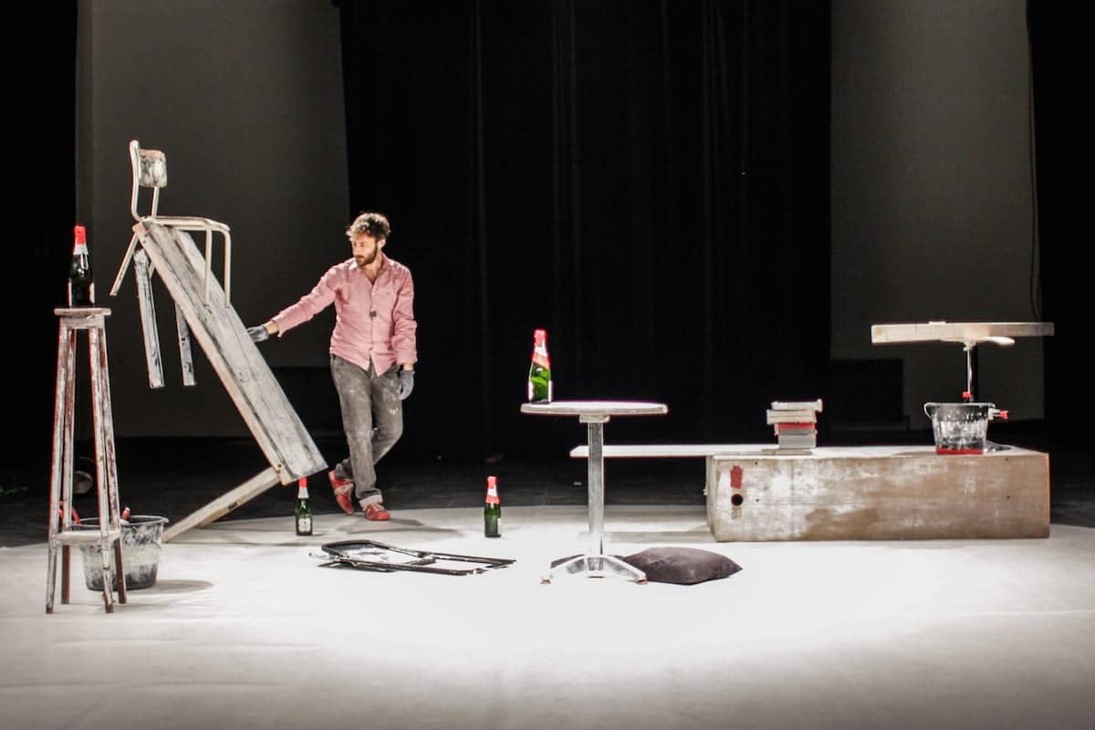 „In this world, in this place, in this theatre…“, immer und immer wieder versucht Layes das Gedicht, das er nicht imstande ist, in Ruhe vorzutragen, von vorne zu beginnen. Zumindest schafft er es, jedes Mal ein neues Nomen hinzuzufügen. Dann aber kommt ihm wieder seine Rastlosigkeit dazwischen. Zu eingespielten, harten Trommelschlägen beginnt er die schwere Kiste mit einem Seil hochzuziehen. Auch das Vierkantholz darf sich mittels eines Seils in die Luft schwingen und nach und nach werden alle Objekte, die luftige Höhe schnuppern dürfen, in Bewegung gesetzt. Ein Riesen-Perpetuum-Mobile baumelt über der Bühne, ein wahrhaft skulpturales Gebilde, das den Eindruck erweckt, als hätten sich hier ein paar Seilakrobaten einfach verdinglicht.