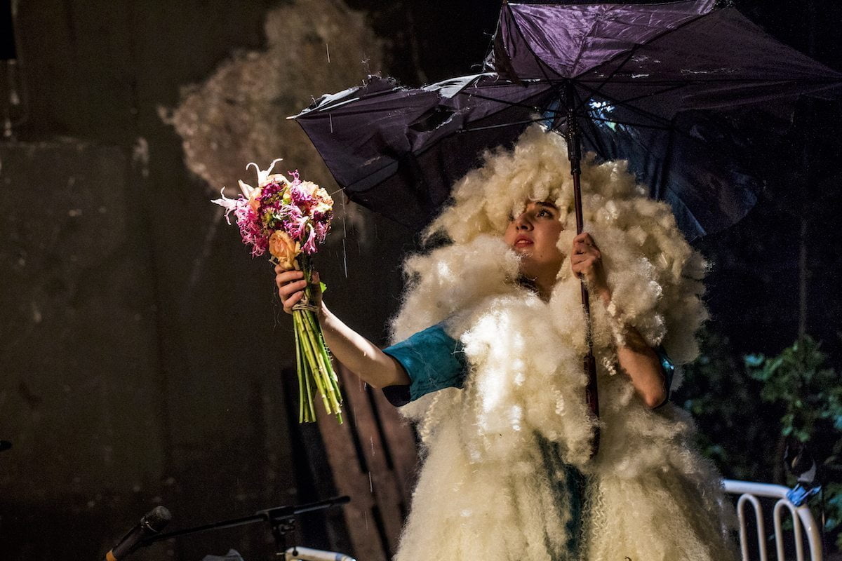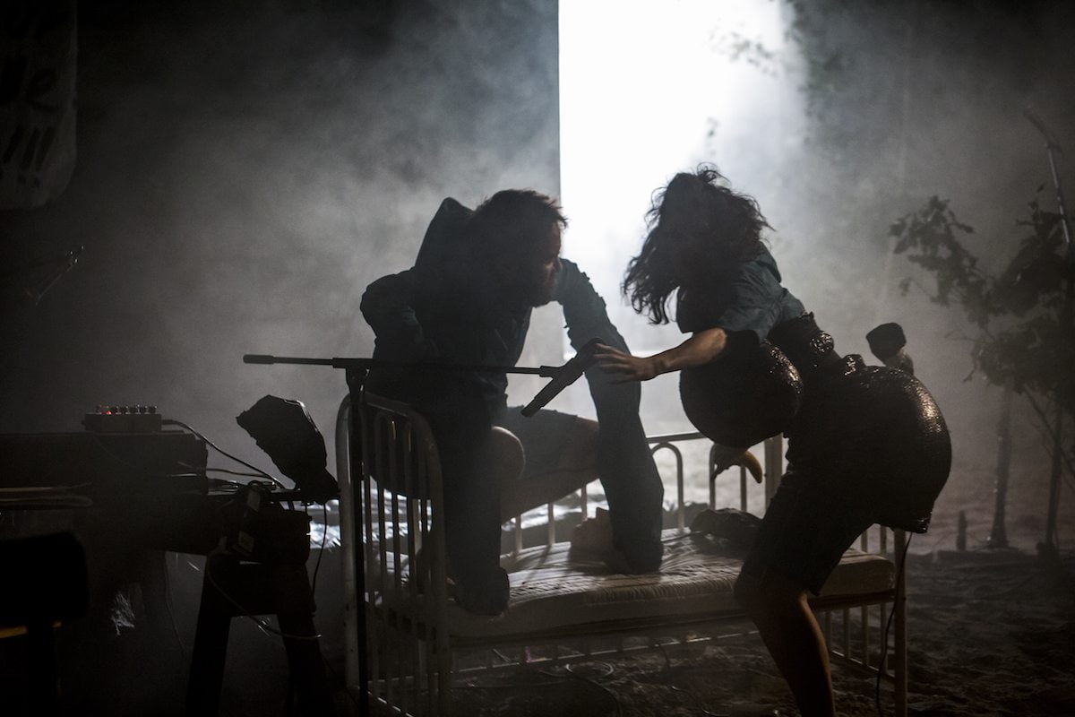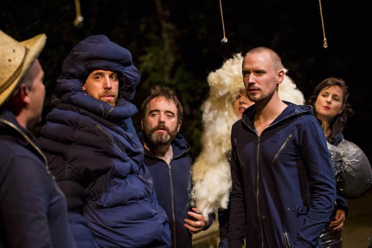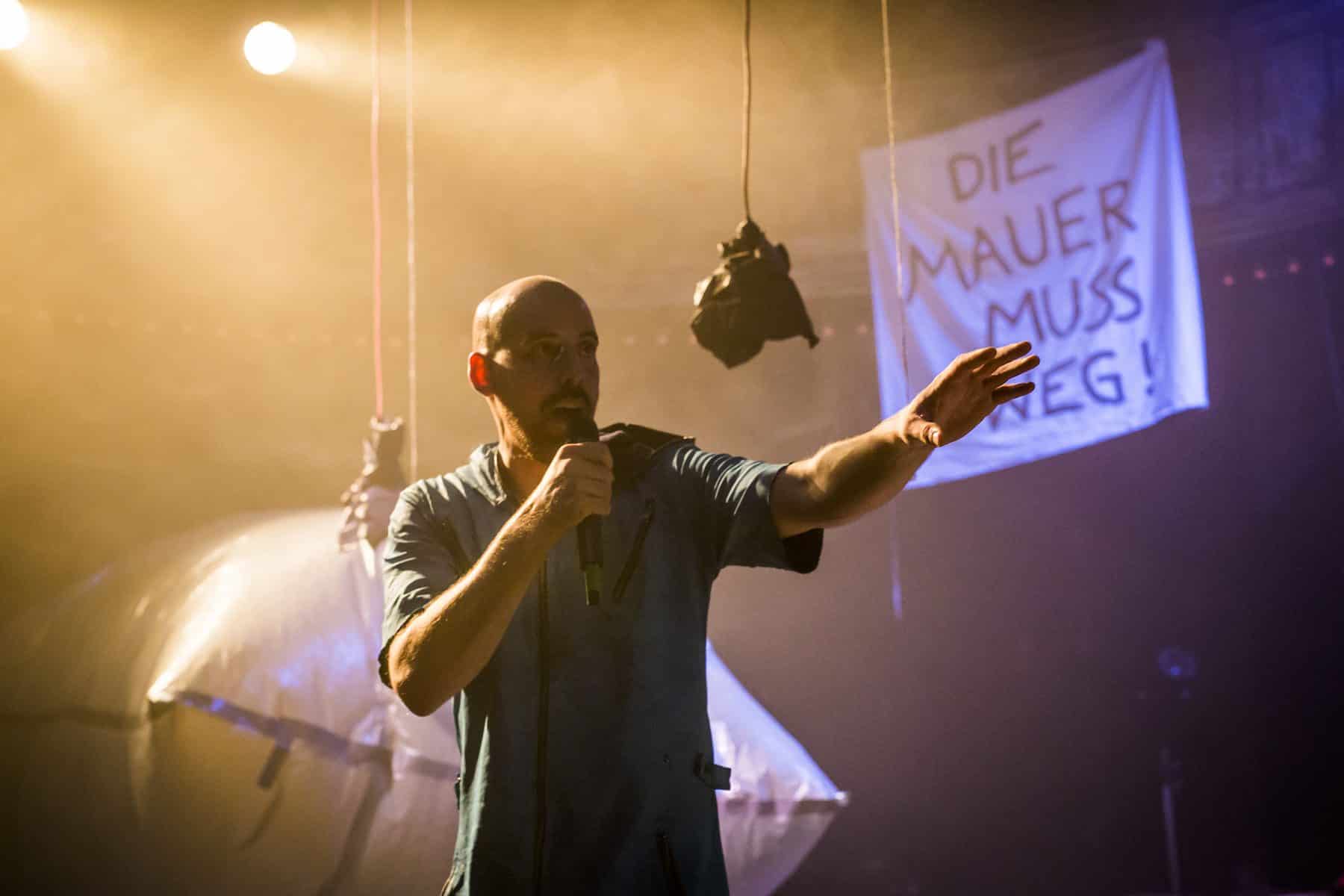 Das ist zum einen der Umgang mit Musik (Jacob Suske). Das Ensemble macht diese auf der Bühne selbst. Greift in die Saiten, bedient Percussion- und Tasteninstrumente und singt dazu. Zum anderen ist es der ungewöhnliche Umgang mit dem Bühnenraum. In dieser Produktion sitzt das Publikum nicht wie gewohnt in Reihen, die in die Saaltiefe gehen. Vielmehr erstreckt sich die Bühne über die ganze Raumlänge und lässt die Zusehenden auf der Gegenüberseite Platz nehmen. Auch technische Eingriffe, wie das Ein- und Ausschalten von Licht, werden vom Ensemble selbst vorgenommen. Auch das Betreten des Zuschauerbereiches – hier durch rasche Auf- und Abgänge während des Stücks – gehört zum bereits bewährten Gestaltungskanon. Als Kostüme dienen Arbeitsoveralls jeglicher Couleur, das Bühnenbild präsentiert sich minimalistisch, aber stets trashig.