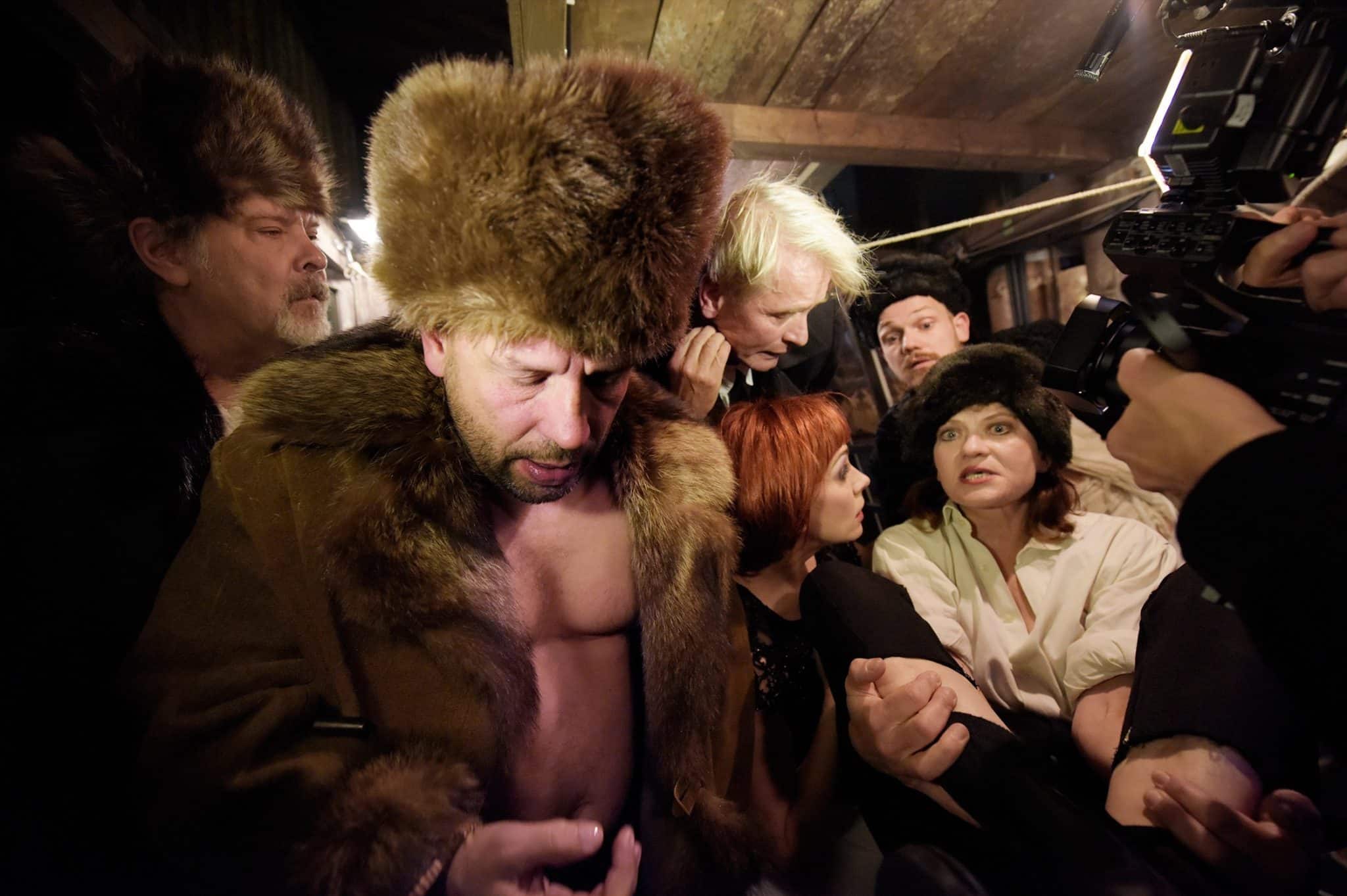 Das Ensemble glänzt mit einer Leistung, die auf höchstem Niveau angesiedelt ist. Die 5-stündige Aufführung forderte offenbar nur das Publikum, das sich nach der Pause zahlenmäßig merklich dezimierte. Bis zum Schluss war kein Augenblick von Ermüdung bei den Schauspielerinnen und Schauspielern festzustellen. Sandra Gerling, Johann Jürgens, Katharina Knap, Horst Kotterba, Matti Krause, Manja Kuhl, Andreas Leupold, Astrid Meyerfeldt, Wolfgang Michalek, Hanna Plaß spielten, als ob es kein Morgen gäbe. Stimmlich agierten sie dabei oft am Lautstärkenlimit, was einen Besucher dazu veranlasste, sich bei seiner Begleitung über Verlust der Sprachkultur auf der Bühne zu beklagen. Castorf ist aber kein ein Schönredner. Wem seine Inszenierungen zu derb erscheinen, hat sich vielleicht im Leben noch nie Gedanken über den Zustand unserer Welt machen müssen. Das, was ich Tschewengur zu sehen war, ist nur ein kleiner Ausschnitt aus der Geschichte und ein noch kleinerer aus dem Leben im Kommunismus – und das für die Bühne geglättet und geschönt. Aber damit scheinen die meisten Kulturkonsumierenden überfordert.