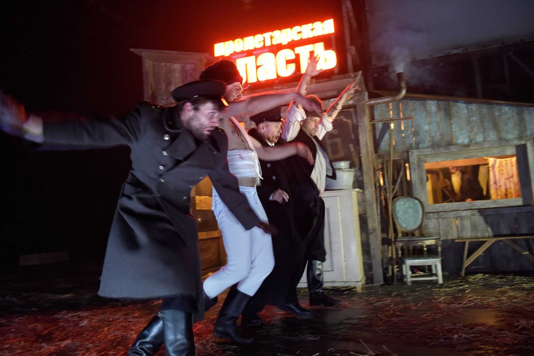 Frank Castorf präsentierte bei seiner Arbeit nicht nur sein Theater, seine Art Regie zu führen, sondern an allererster Stelle Andrej Platonow (1899greg. – 1951). Einen in Österreich wenig bis kaum bekannten Schriftsteller, der zu den ersten Systemkritikern des Kommunismus gehörte und deswegen von Stalin auch mundtot gemacht wurde. „Tschewengur“ ist der Name einer kleinen Stadt, die gerade dabei ist, den Kommunismus zu erlernen. Stepan Kopjonkin, der im Gedenken an die ermordete Rosa Luxemburg „die ganze Welt in die Freiheit des Kommunismus entlassen möchte“, macht sich auf den Weg in die Ortschaft, welche die Feudalherrschaft noch nicht verdaut hat, aber schon mit dem neuen System des Kommunismus zurande kommen soll. Platonows Text wird von Castorf, eigentlich bedürfte das keiner besonderen Erwähnung, nicht eins zu eins auf die Bühne gebracht. Die Geschichte, die ein veritables Untergangsszenario präsentiert, wird immer wieder durch Szenen unterbrochen, in welchem er das Theater an sich meisterlich zelebriert.
