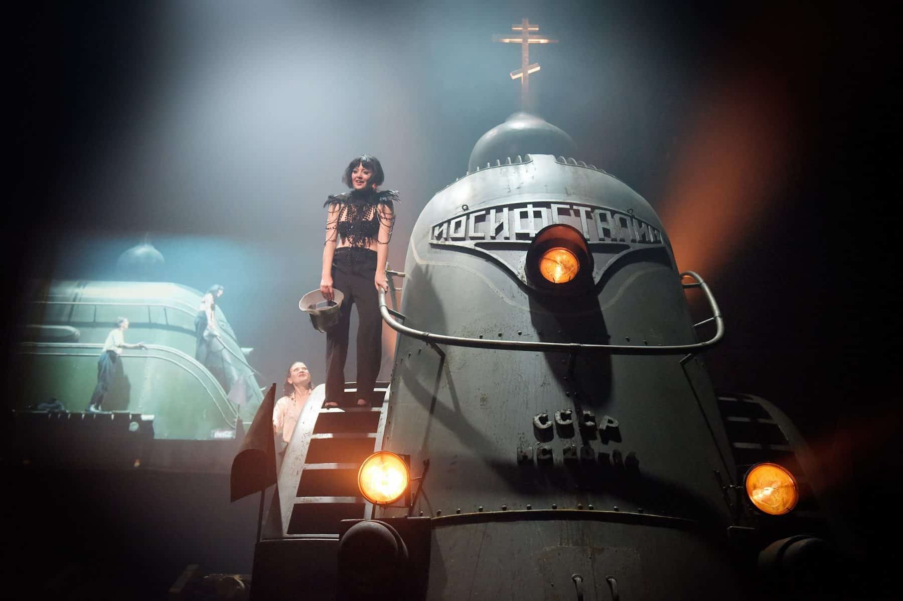 Ein Monster beherrscht den Bühnenraum. Ein technisches Monster, ein Hybrid aus einer Propellermaschine, einer Windmühle und einer riesigen Dampflok. Bedrohlich steht es da und man kann erahnen, dass sein Inneres nicht weniger bedrohlich als sein Äußeres ist.