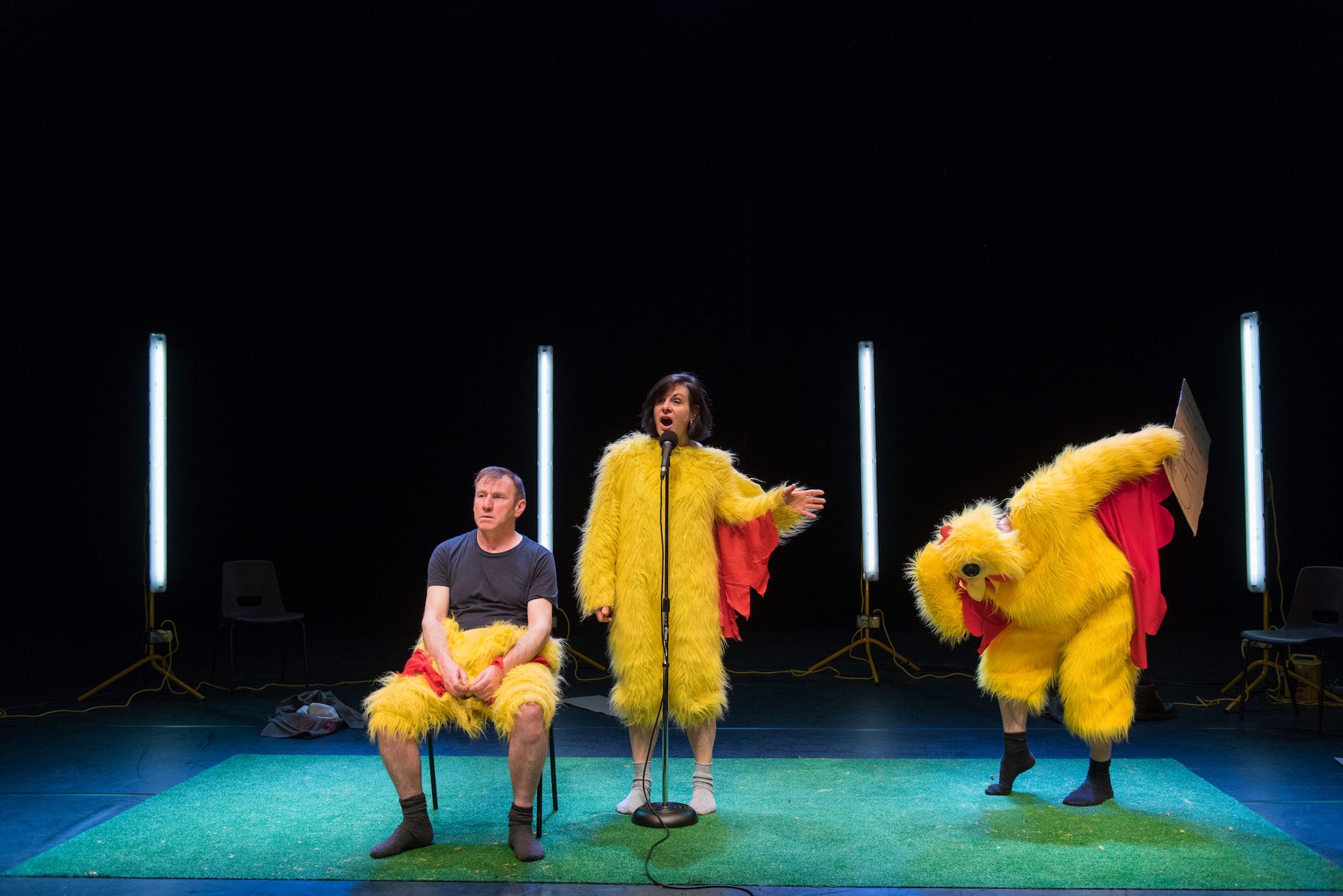Der Sketch wird mal schneller, mal langsamer von Claire Marshall, Richard Lowdon und Jerry Killick – drei der insgesamt sechs Performer von Forced Entertainment – aufgeführt. Die jeweilige Stimmung wird entweder durch die Musik von Georg Philipp Telemanns Fantasia Nummer 1 oder schneller Zirkusmusik untermalt. Auf der Bühne befinden sich nur zwei Sessel, ein Mikrofon, einige Leuchtröhren und Hahnenkostüme, die im Laufe der Performance zum Einsatz kommen.