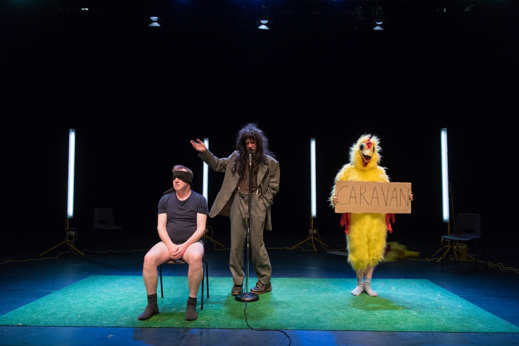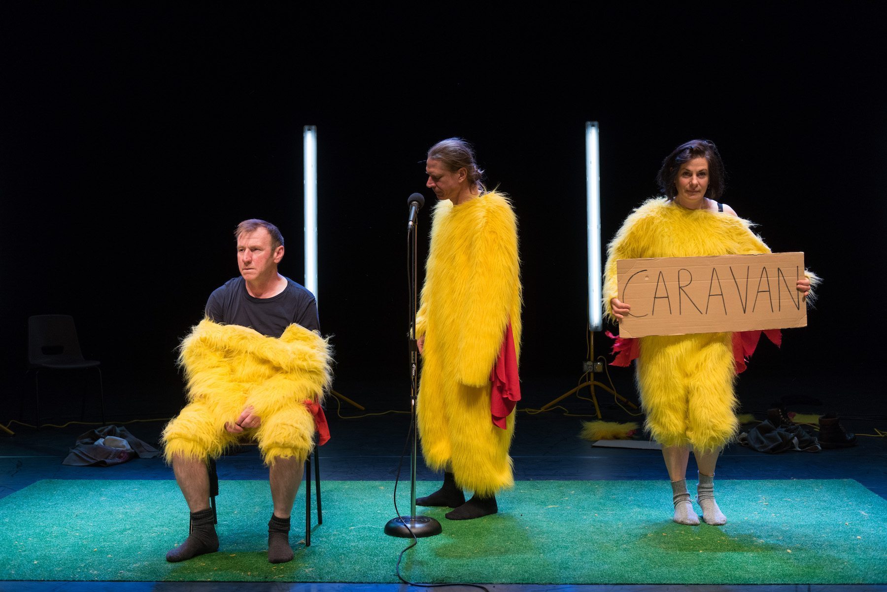 Der Sketch wird mal schneller, mal langsamer von Claire Marshall, Richard Lowdon und Jerry Killick – drei der insgesamt sechs Performer von Forced Entertainment – aufgeführt. Die jeweilige Stimmung wird entweder durch die Musik von Georg Philipp Telemanns Fantasia Nummer 1 oder schneller Zirkusmusik untermalt. Auf der Bühne befinden sich nur zwei Sessel, ein Mikrofon, einige Leuchtröhren und Hahnenkostüme, die im Laufe der Performance zum Einsatz kommen.