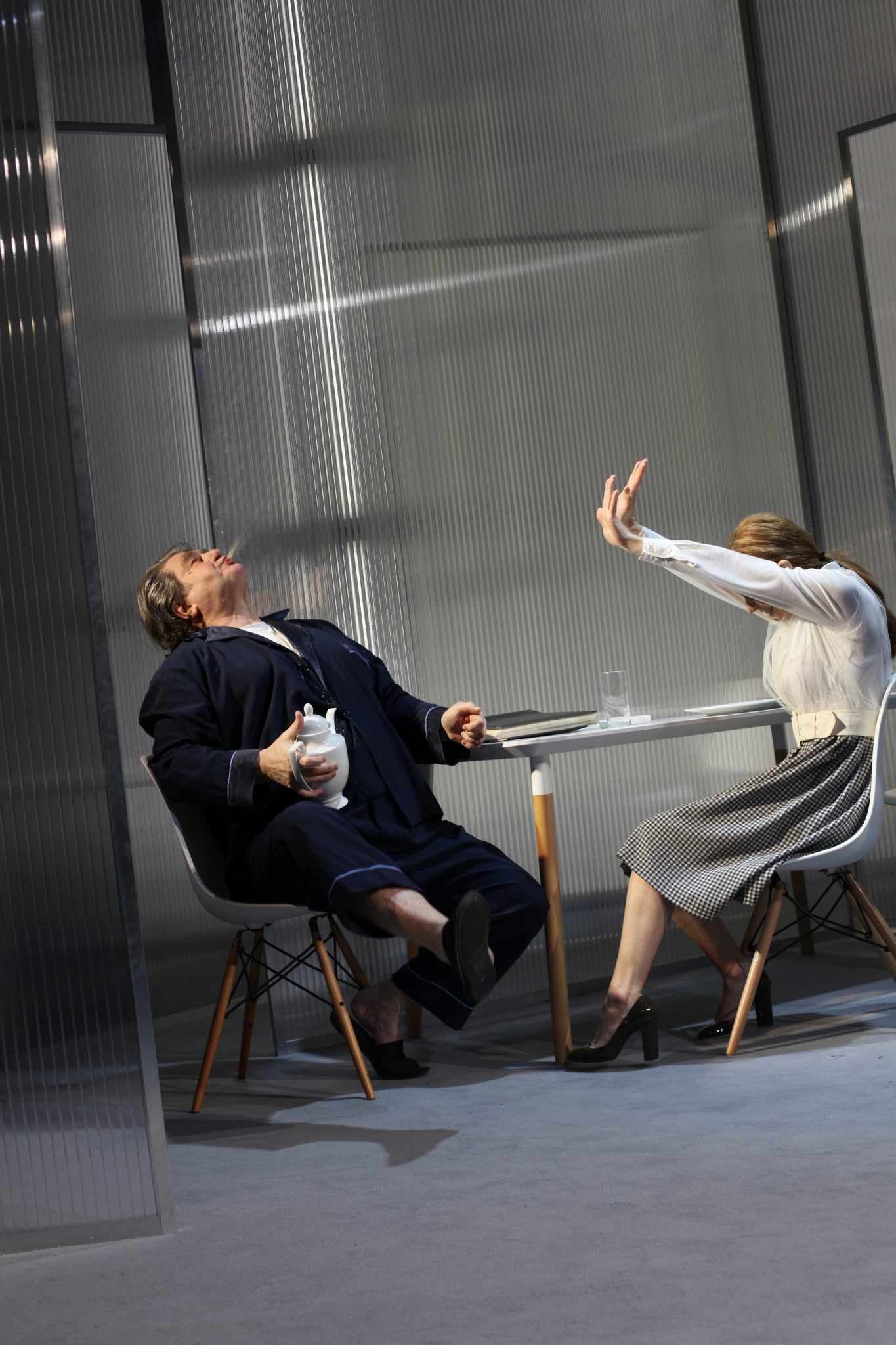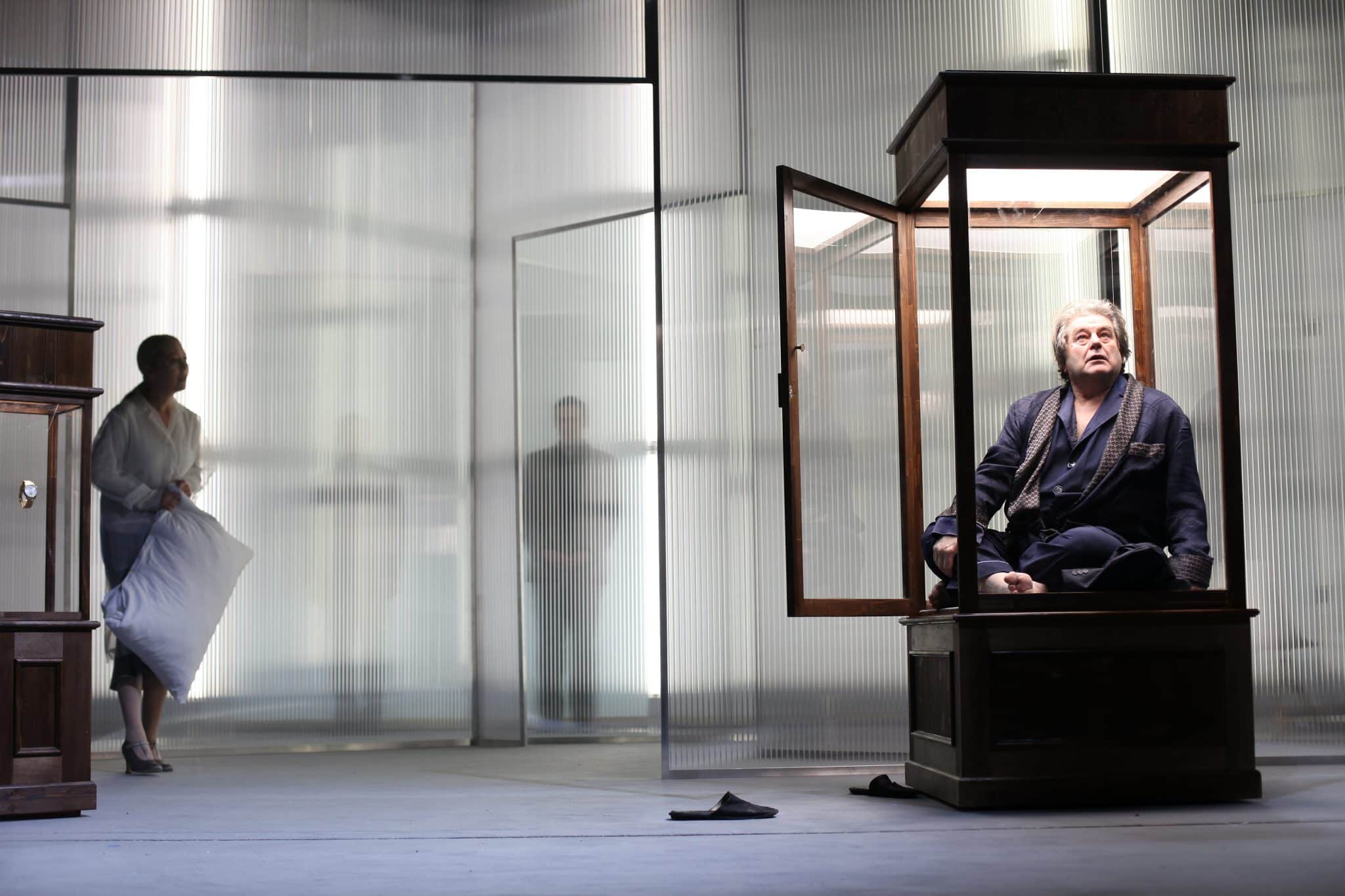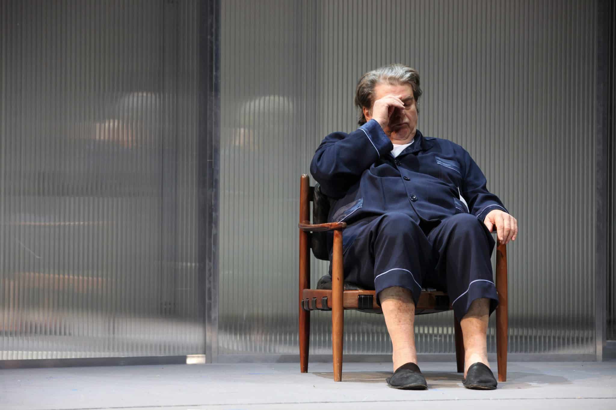 Szene um Szene nimmt die Vergesslichkeit zu, was man Steinhauer auch am Äußeren ansieht. War es zuerst nur ein unbesocktes Bein, das unter der dunkelblauen Anzughose hervorlugte, ist er später nur mehr im Schlafanzug anzutreffen, ohne dass er dies als Manko empfindet. In den im Halbdunkel stattfindenden Umbauten werden nur kleine Veränderungen des Bühnenbildes (Raimund Orfeo Voigt) vorgenommen. Plexiglaswände, ein Tisch und einige Sessel, mehr braucht es nicht, um die verschiedenen Orte zu kennzeichnen, die der alte Herr nacheinander bewohnt. Den Umzug zu seiner Tochter bekommt er nicht mehr wirklich mit, wundert sich nur über fehlende Möbel.